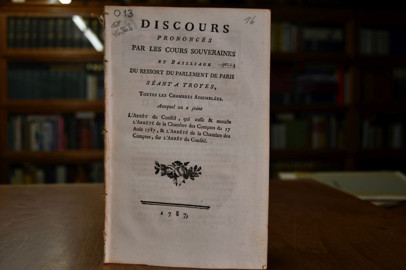 Discours Prononces par les Cours Souveraines et Bailliage du Ressort du Parlement de Paris seant a Troyes, Toutes les Chambres Assemblees AUxquet on a joint L`Arret du Conseil, qui casse & annulle L`Arrete de la Chambre des Comptes du 17 Aout 1787, & L`Arrete de la Chambre des Comptes, sur L`Arret du Conseil.