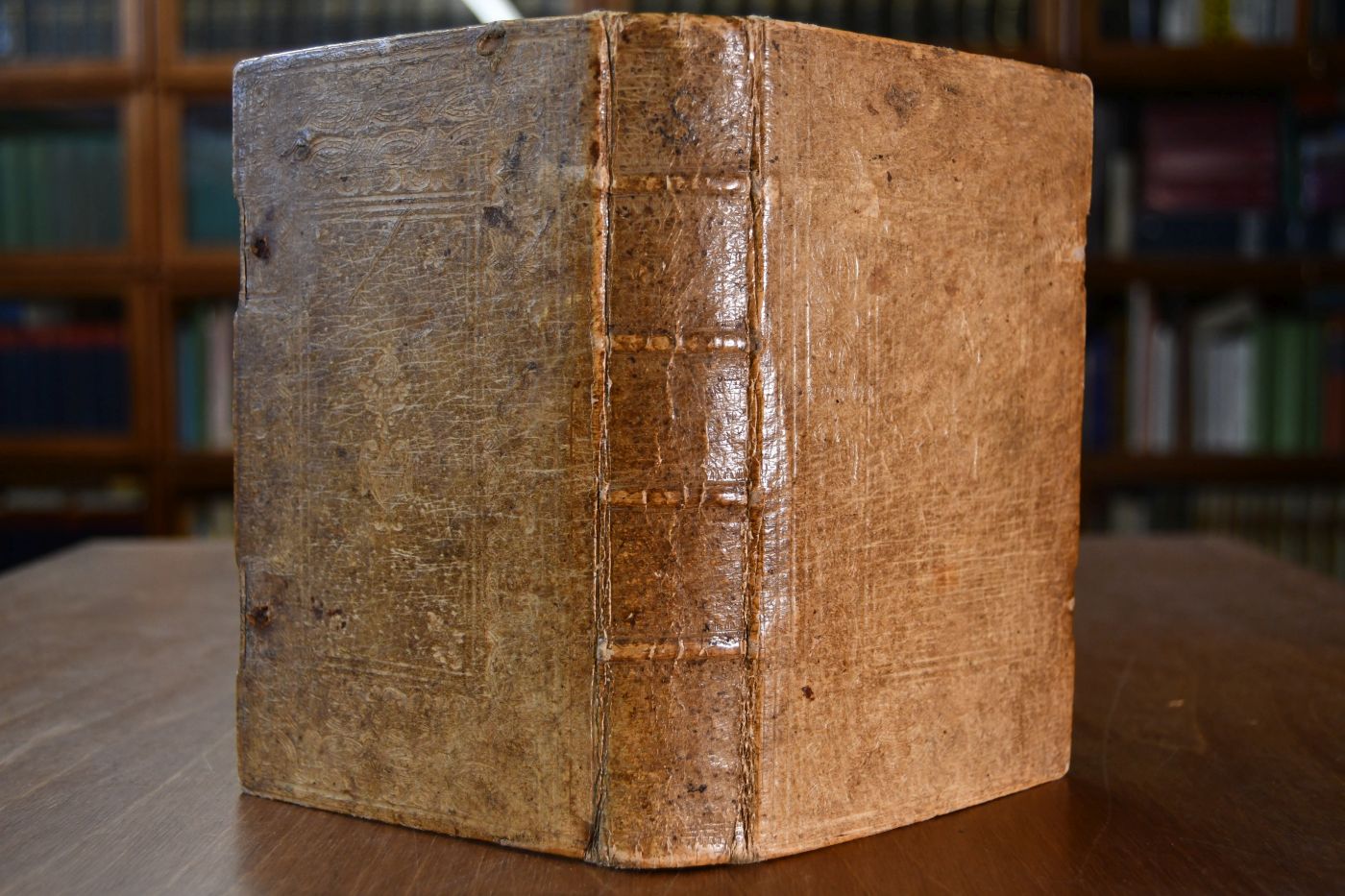 Format 19 x 12 cm, geprägtes Schweinsleder der Zeit auf vier Bünden, mit Rückenschild, 2 Schließen und einem umlaufenden Rotschnitt