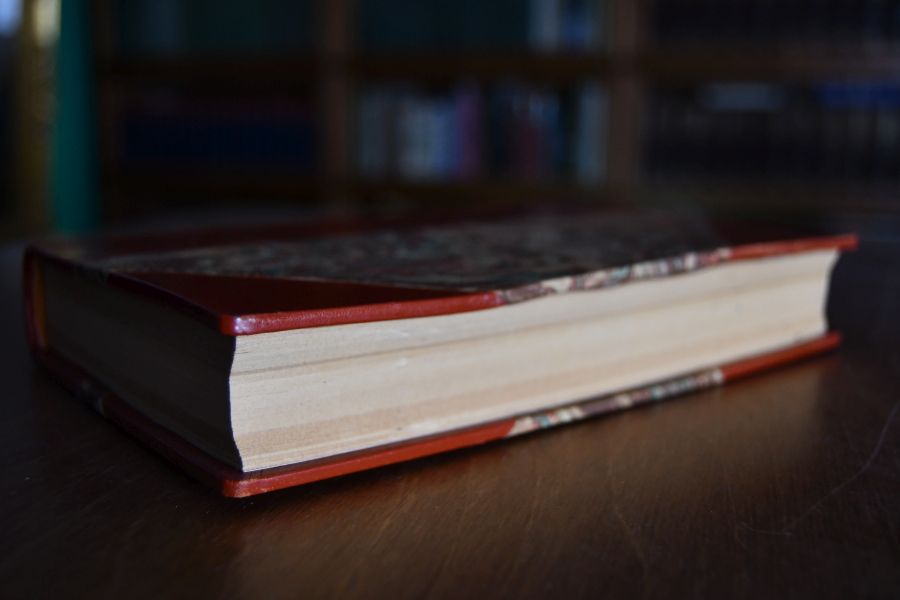Format 21 x 14 cm, privates Halbleinen mit Rückenvergoldung und Kopffarbschnitt sowie eigebundenen Broschurdeckeln