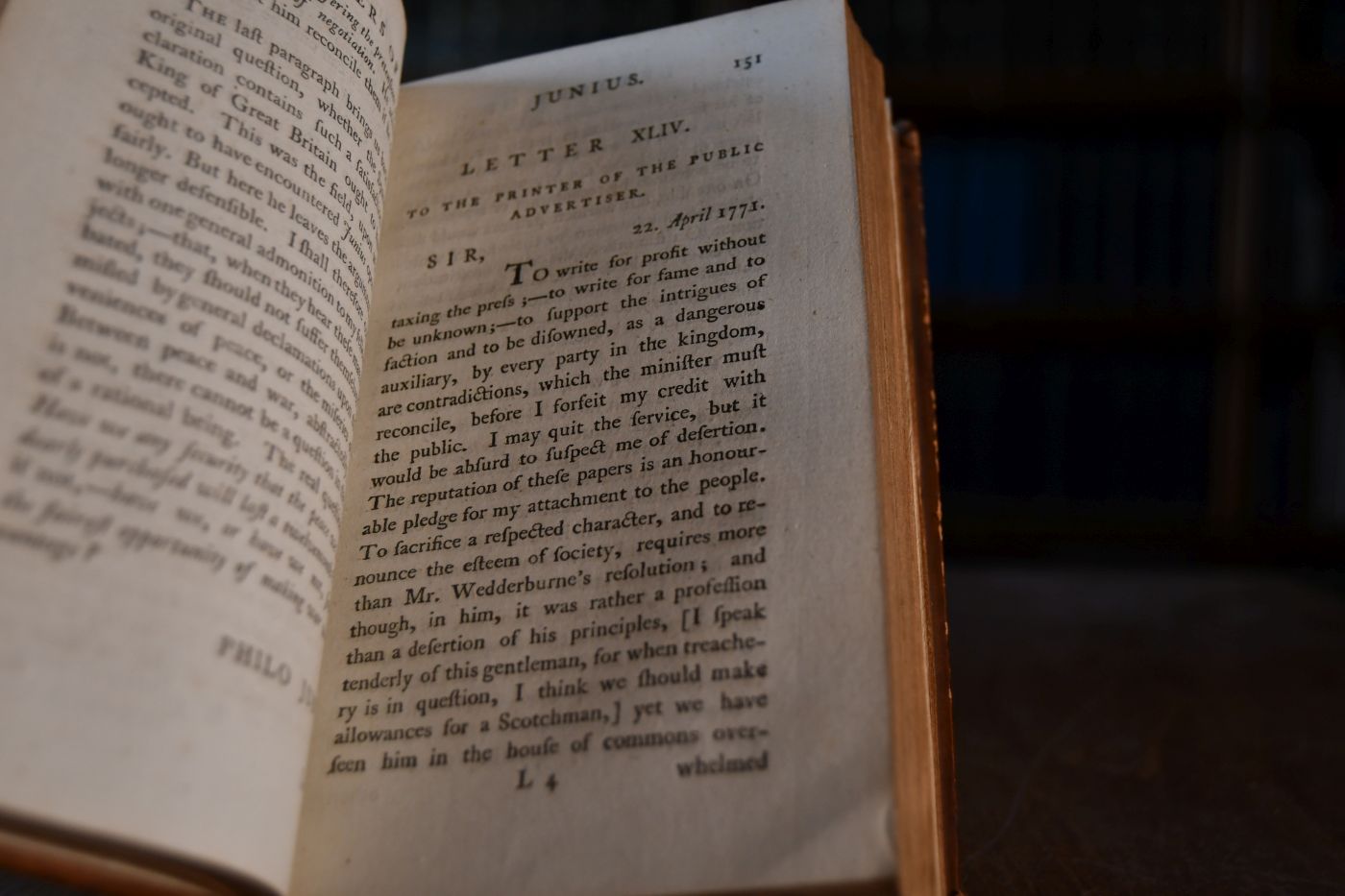 Beschreibung Einband berieben und bestoßen. Rückenschild abgegangen. Vorätze und Titel fleckig. Innen immer wieder fleckig. Erster autorisierter Londoner Druck der Sammlung von politisch-satirischen Briefen, die unter dem Pseudonym Junius zuerst in der Zeitschrift Public Advertiser in London vom 21. Januar 1769 bis zum 12. Mai 1772 erschienen und in denen der Verfasser den englischen König, Parlament, Minister, Gerichtshöfe, Staatsbeamte etc. geistreich und schonungslos aufs Korn nimmt.