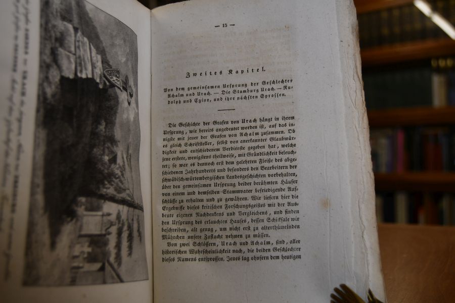 Beschreibung Einband berieben, bestoßen und gebräunbt. Unbeschnittene Ränder angeschmutzt und gebräunt. Gelegentlich etwas fleckig. Mit den schönen Ansichten von Hohenurach, Hausach und Fürstenberg.