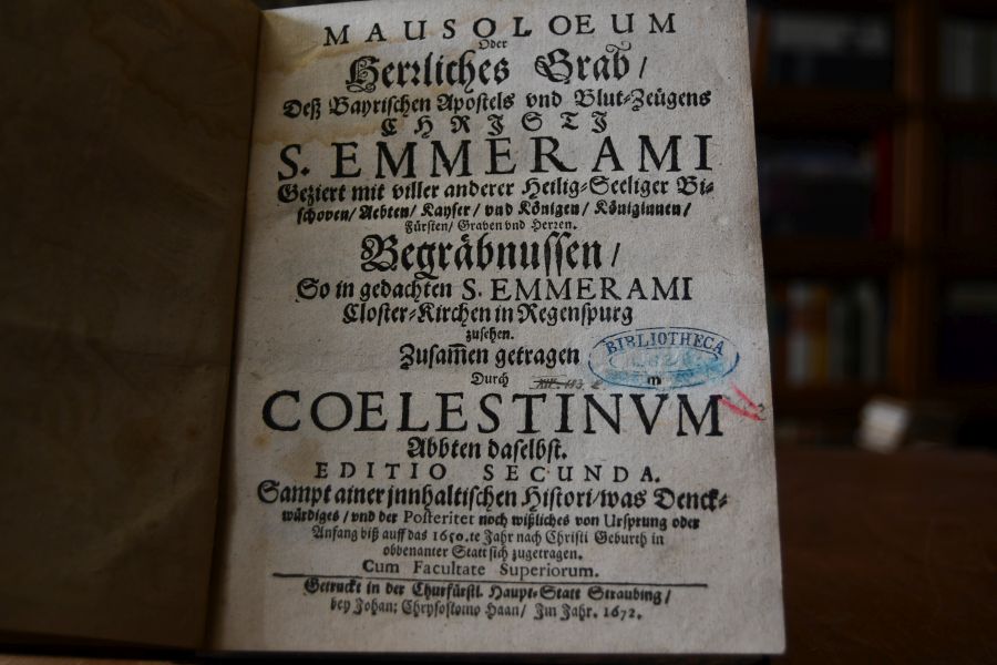 Beschreibung Einband berieben und bestoßen. Handschriftlicher Besitzereintrag auf Vorsatz. Titel mit teilweise ausradiertem Besitzerstempel und handschriftl. Ordnungsnummer. Wenige Seiten oben mit Wasserrand ansonsten sauberes Exemplar. Mit vier Kupfern: 1. Das gestochene und oben bis an den Rand beschnittene Frontispiz zeigt ein allegorisches Bild vor einem doppelköpfigen gekrönten Adler, darunter eine kleine Ansicht des Klosters, umgeben von zwei heraldischen Löwen. 2. Porträtkupfer des Autors von Matthias von Sommern. 3. Grundriß der Klosterkirche. 4. Altar mit Tabernakel. Das Werk ist "Maximilian Emanuel In Obern und Nidern Bayrn, auch der Obern Pfaltz Hertzogen" gewidmet. Neben der Historie des Hl. Emmeram enthält es eine Geschichte Regensburgs. Coelestin Vogl (1613-1691) aus Immenstadt, ein Benediktiner, der zu St. Emmeram in Regensburg in den Orden eintrat, 1639 die Priesterweihe empfing und 1655 zum Abt dieses Klosters gewählt wurde, war ab 1669 Administrator des Klosters Reichenbach. Er wirkte als Präses der Bayerischen Benediktiner-Kongregation von 1684 an und war Delegierter des Reichsprälaten des Schwäbischen Kreises beim Reichstag. Vogl widmete sich historischen Studien, wie er auch zahlreiche Gelehrte nach St. Emmeram brachte.
