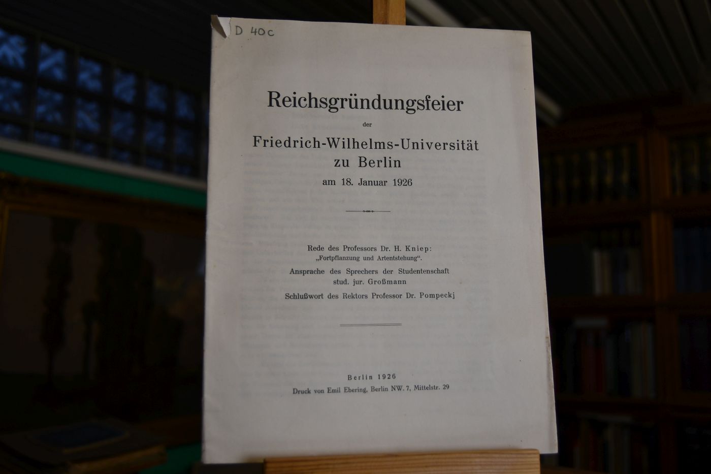 Rede des Professors. Dr. H. Kniep: "Fortpflanzung und Artentstehung", Ansprache des Sprechers der Studentenschaft stud. jur. Großmann. Schlußwort des Rektors Professor Dr. Pompeckj.