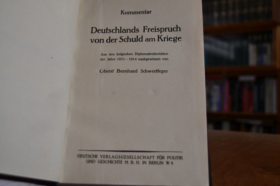 Kommentar. Deutschlands Freispruch von der Schuld am Kriege. Aus den belgischen Diplomatenberichten der Jahre 1871-1914 nachgewiesen. Beigebunden Bernhard Sc hwertfeger, Poincare und die Schuld am Kriege, Nach Poincares Vorträgen in der "Societe des Conferences", Berlin, 1921, 118 S.; Bernhard Schwertfeger, Der "Tiger", Die Kriegsreden Georges Clemenceaus, Berlin, 1921, 185 S.