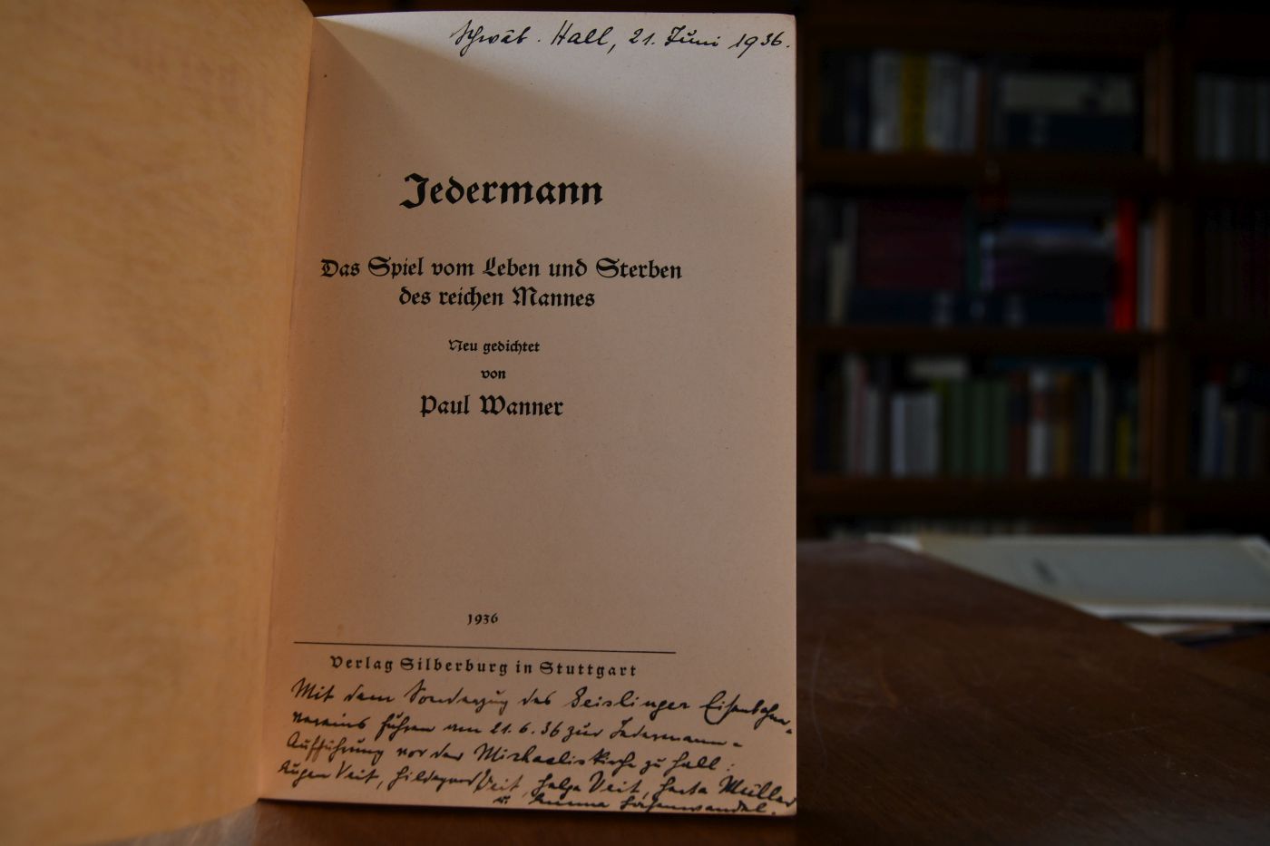 Beschreibung Einband berieben, bestoßen und fleckig. Handschriftlicher Besitzereintrag auf Vorderdeckel und private Notizen über den Besuch der Jedermann-Aufführung in Schwäbisch Hall vom 21.6.1936 auf dem Titel.