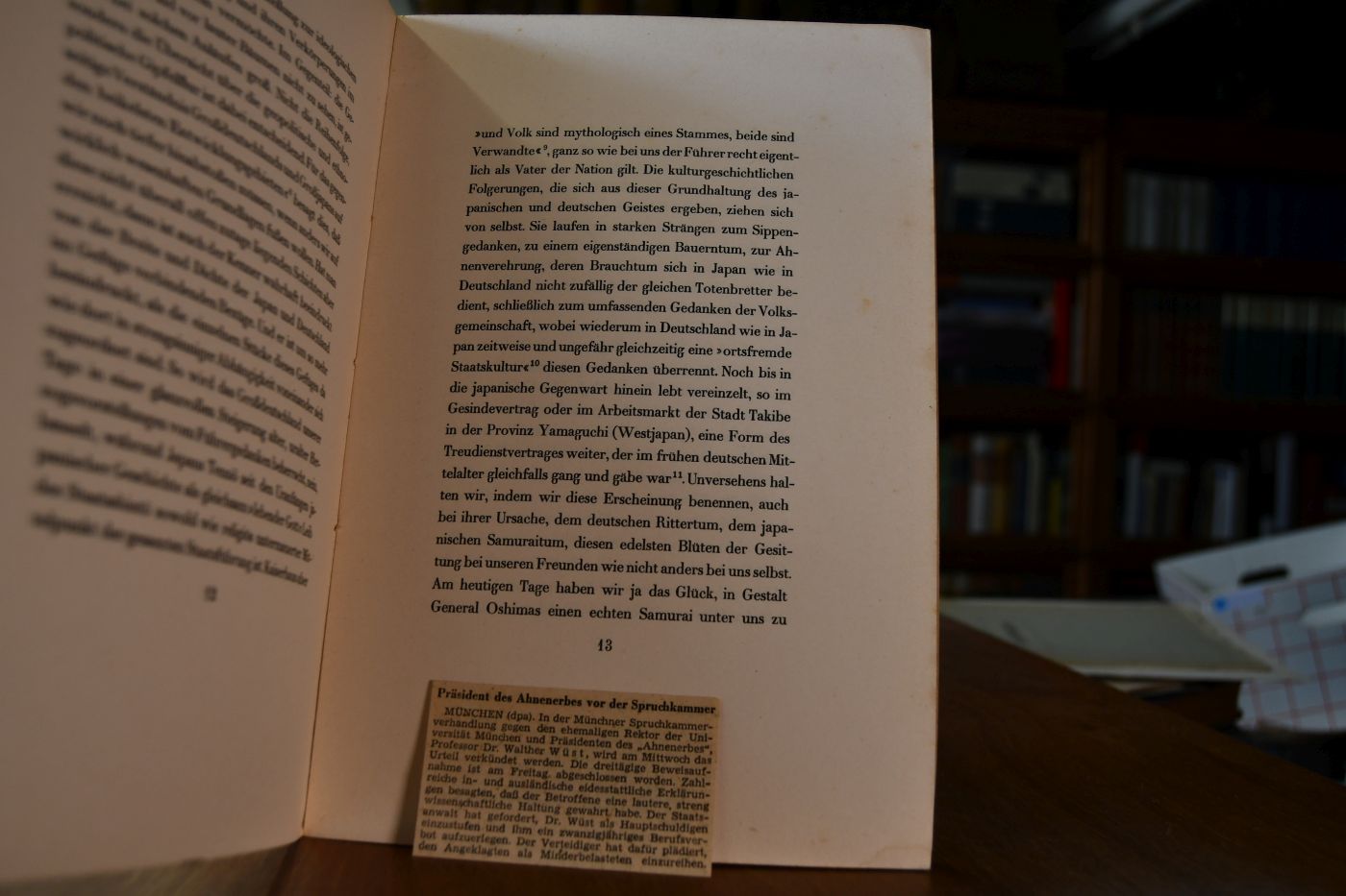 Beschreibung Einband berieben, bestoßen, angeschmutzt und fleckig. Schnitt und innen gelegentlich fleckig. Beiliegend ein kleiner Zeitungsausschnitt (StZ vom 7.11.1949) über das Entnazifizierungsverfahren von Walther Wüst.