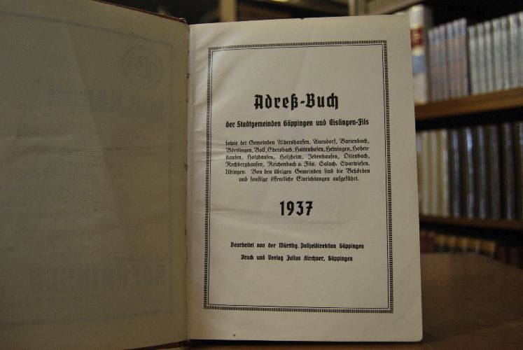 Adreß-Buch der Stadtgemeinden Göppingen und Eislingen-Fils sowie der Gemeinden Albershausen, Auendorf, Bartenbach, Börtlingen, Boll, Ebersbach, Hattenhofen, Heiningen, Hohenstaufen, Holzhausen, Holzheim, Jebenhausen, Ottenbach, Rechberghausen, Reichenbach a.d. Fils, Salach, Sparwiesen, Uhingen. Von den übrigen Gemeinden sind die Behörden und sonstige öffentliche Einrichtungen aufgeführt. 1937.