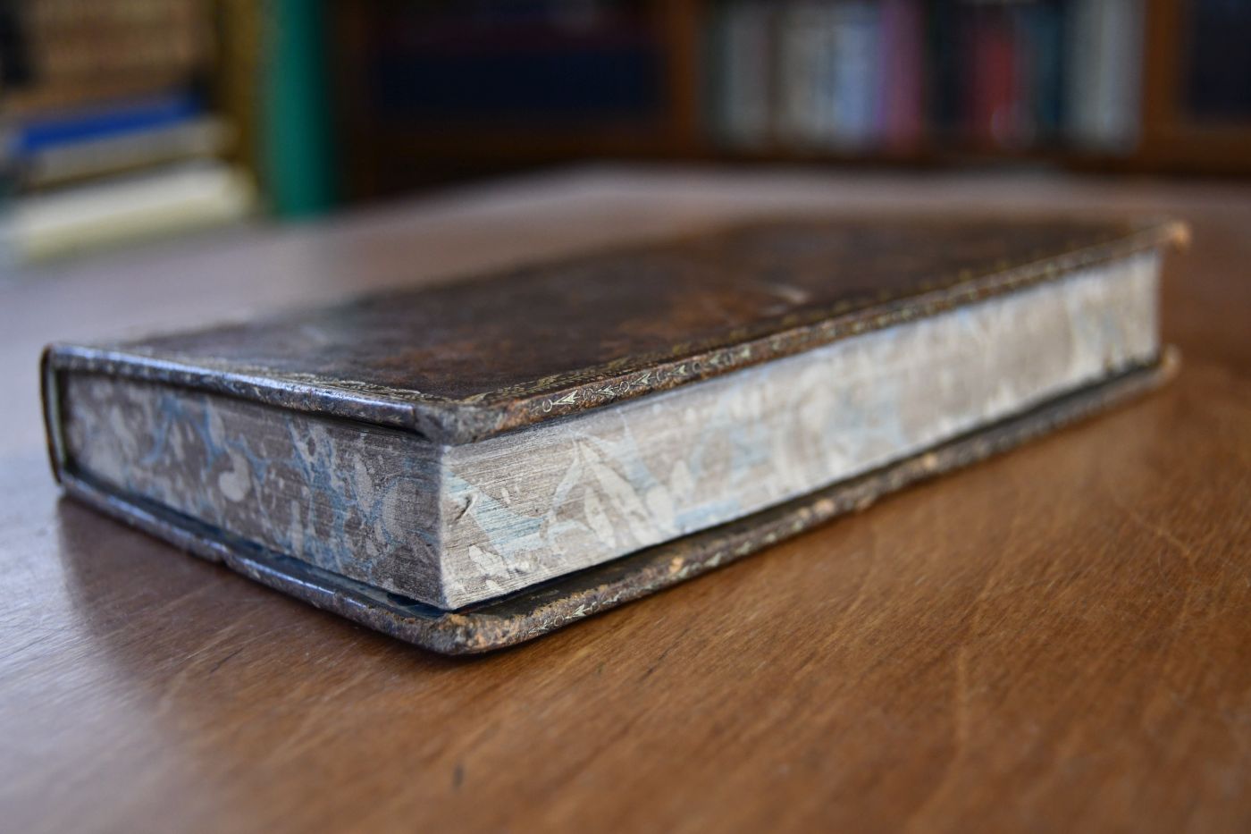 Format 18 x 11 cm, Leder mit umlaufendem marmorierten Schnitt, Rückenschild, -vergoldung