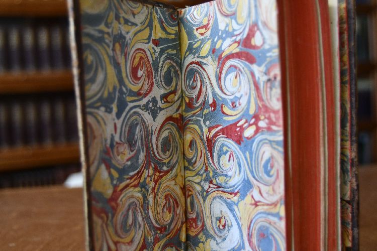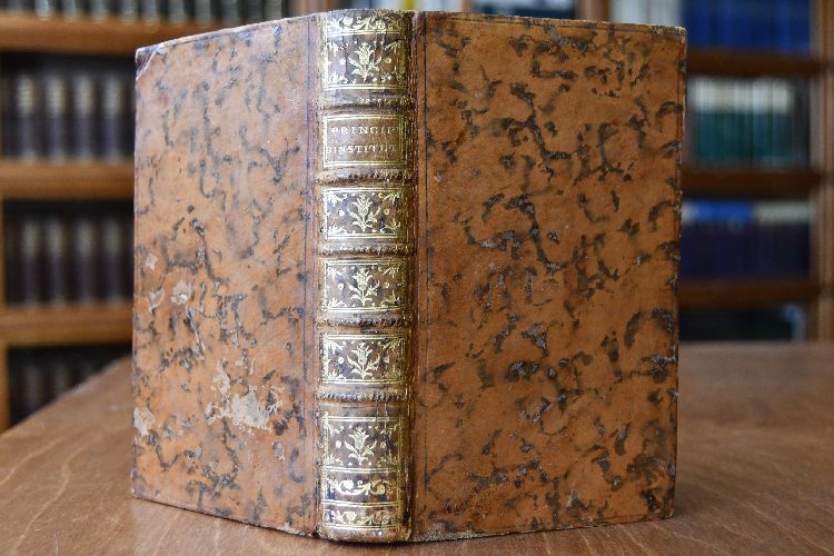 Format 18 x 11 cm, Leder der Zeit mit 5 Bünden, Rückenschild, Rückenvergoldung und umlaufendem Rotschnitt