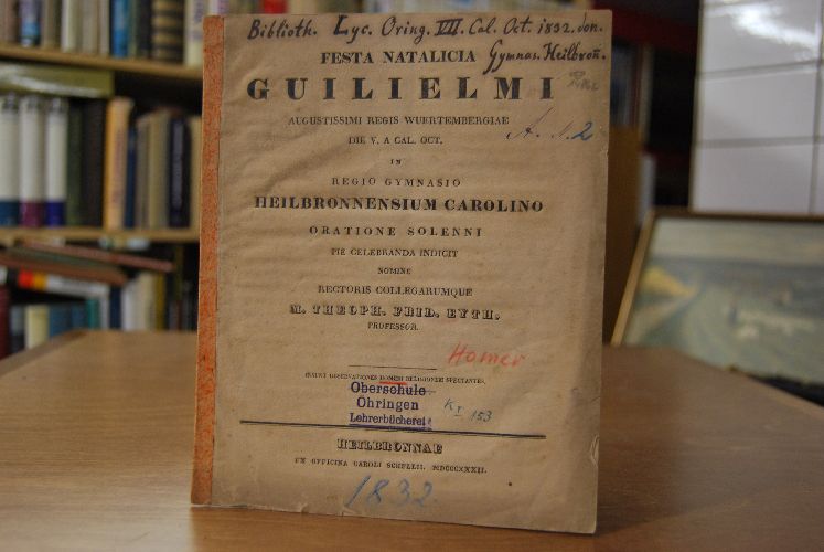 Festa Natalica Guilielmi augustissimi regis Wuertembergiae die V. a Cal. Oct. in regio Gymnasio Heilbronnensium Carolino Oratione Solenni pie celebranda indicit nomine Rectoris collegiarumque M. Theoph. Frid. Eyth, Professor. "Insunt pobservationes Homeri religionem spectantes."