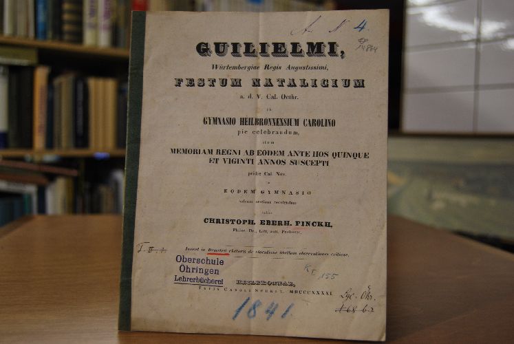 Festa Natalica Guilielmi augustissimi regis Wuertembergiae die V. a Cal. Oct. in regio Gymnasio Heilbronnensium Carolino Oratione Solenni pie celebrandum item Memoriam regni ab eodem ante hos quinque et viginti annos suscepti pridie Cal. Nov. in eodem Gymnasio solenni oratione recolendam indicit Christoph. Eberh. Finckh Philos. Dr., Litt. antt. Professor "Insunt in Demetrii rhetoris de elocutione libellum observationes criticae.."