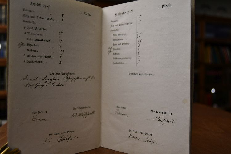 Beschreibung Zeugnisse von 1911 bis 1919. Mit Unterschriften des Rektors Hausser und der Lehrer: M. Maußknecht, L. Krais, M. Klein, H. Roth, G. Ziegler, Röcker, B. Berini.