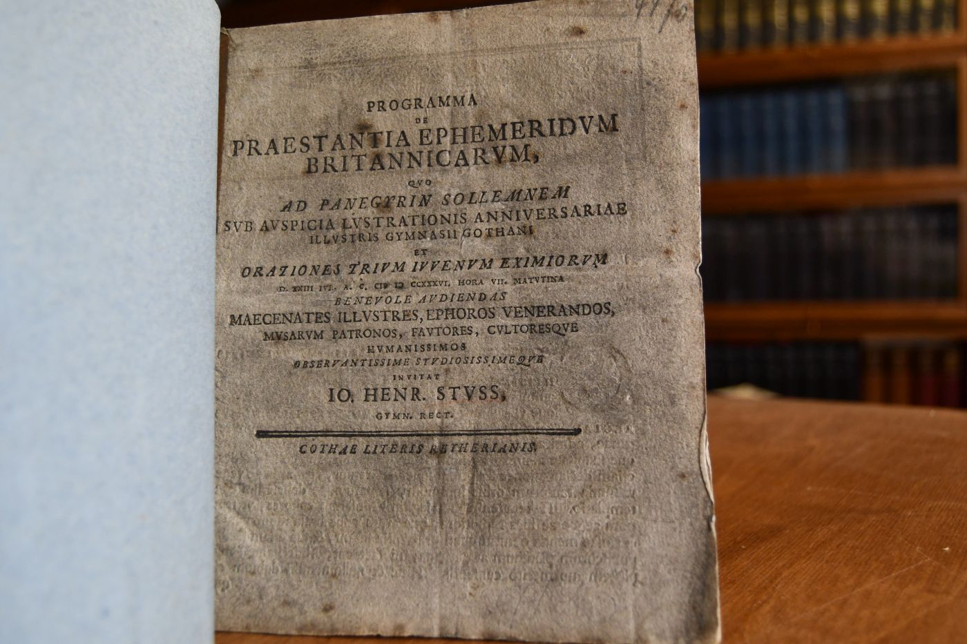 Programma De Praestantia Ephemeridvm Britannicarvm. Qvo Ad Panegyrin Sollemnem Svb Avspicia Lvstrationis Anniversariae Illvstris Gymnasii Gothani Et Orationes Trivm Ivvenvm Eximiorvm D. XXIII Ivl. A.C. M D CCXXXVI. ... Avdiendas ... Invitat Io. Henr. Stvss, Gymn. Rect. ; [P.P. D. XXII. Ivl. A. M DCC XXXVI.]