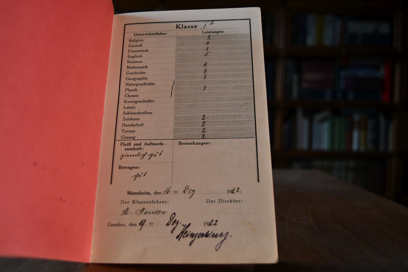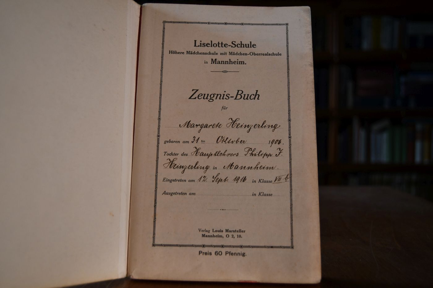 Zeugnis-Buch der Liselotte-Schule. Höhere Mädchenschule mit Mädchen-Oberschule in Mannheim für Margarete Heinzerling Tochter des Hauptlehrers Philipp J. Heinzerling. 1916-1923.