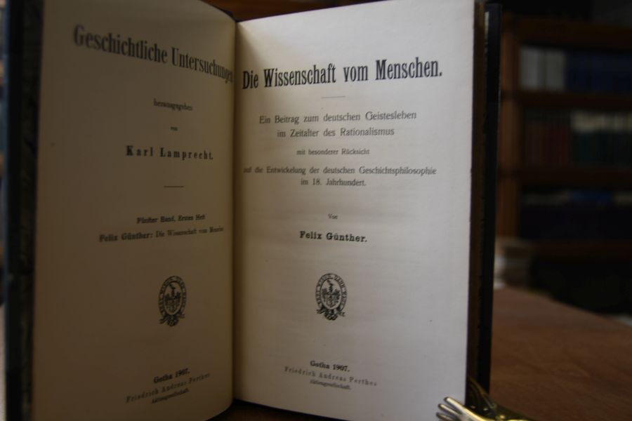 Die Wissenschaft vom Menschen. Ein Beitrag zum deutschen Geistesleben im Zeitalter des Rationalismus mit besonderer Rücksicht auf die Entwicklung der deutschen Geschichtsphilosophie im 18. Jahrhundert. Beigebunden Pflaum Chr. D., J.G. Droysens Historik in ihrer Bedeutung für die moderne Geschichtswissenschaft.