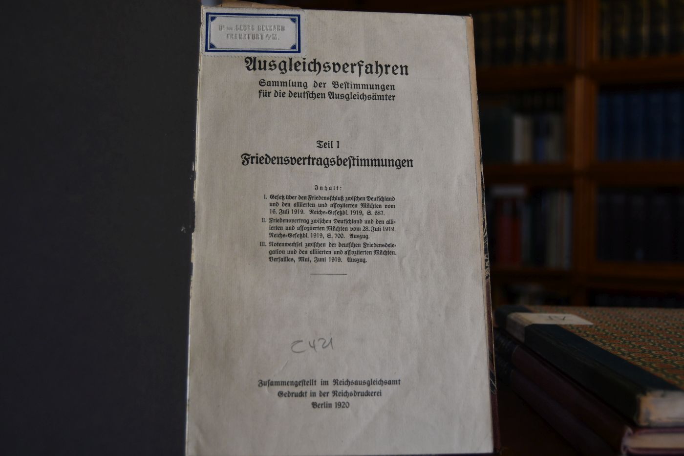Ausgleichsverfahren. Sammlung der Bestimmungen für die deutschen Ausgleichsämter. Teile I-IV in 4 Bdn. Friedensbestimmungen, Ausführung des Friedensvertrags (Deutschland), Ausführung des Friedensvertrages (Gegnerstaaten), Ausführung des Friedensvertrages (Deutschland), Ergänzung zu Teil II.