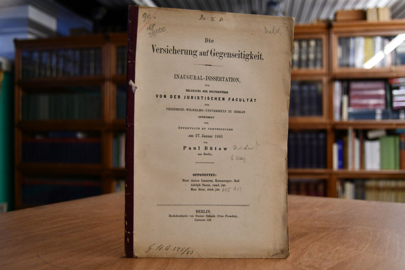 Beschreibung Einband berieben, bestoßen, angeschmutzt und mit Einrissen. Bibliotheksexemplar (K.Preuss.Geh. Staatsarchiv Berlin) mit den entsprechenden Eintragungen. Paul Bütow war Jude. Unter den Opponenten findet sich Max Beer.