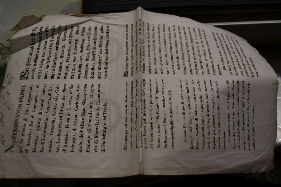 Ferdinand der Erste zeigt den Central- und Provinzial-Congregationen und den Podesta`s aller Städte an, dass sie sich Anfang September nach Mailand zu begeben haben um ihm dort zu huldigen. Die Eidesformel wird mitgeteilt. 2sprachig italienisch und deutsch.