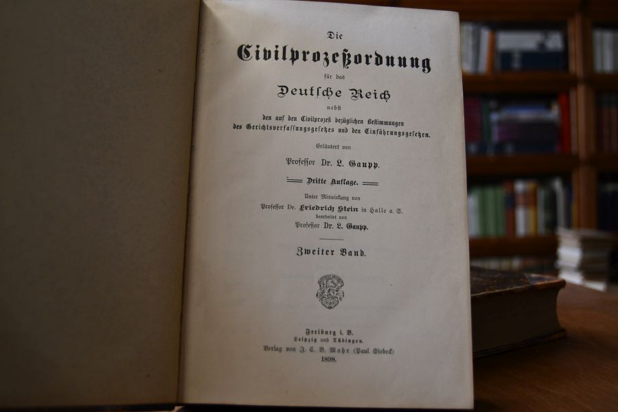 Beschreibung Einband berieben und bestoßen. Handschriftlicher Besitzereintrag auf fliegendem Vorsatz. In Band 1 stellenweise schmaler Feuchtigkeitsrand am oberen Schnitt. Wenige Bleistiftanstreichungen. "Gaupp, Friedrich Ludwig Adolf, Jurist und Politiker, * 10.12.1832 Ellwangen/Jagst, † 6.7.1901 Tübingen. G. studierte die Rechte in Tübingen, wurde 1866 Oberjustizassessor in Eßlingen und kam 1873 an das Kreisgericht Ellwangen, dem er bis 1884 als Kreisgerichtsrat angehörte. 1866 trat er der damals gegründeten Deutschen Partei bei und vertrat später als Abgeordneter der nationalliberalen Partei 1874-77 den württembergischen 6. Wahlkreis im Reichstag. Er gehörte der Justizkommission des Parlaments an, in der die sogenannten Reichsjustizgesetze beraten wurden. Die Verhandlungsprotokolle der Justizkommission (C. Hahn, Gesammelte Materialien zu den Reichsjustizgesetzen, 1879, Band 1, 2) zeigen deutlich das Bild einer eindrucksvollen Richterpersönlichkeit, seinen scharfen juristischen Verstand, seine liberale Gesinnung, strenge Sachlichkeit, aber auch Temperament, Lebenserfahrung und menschliches Verständnis. 1884 schied er wegen eines Gehörleidens aus der Richterlaufbahn aus und lehrte seither als Supplent an der Universität Tübingen Zivilprozeß- und württembergisches Privatrecht, seit 1897 als ordentlicher Honorarprofessor, bis er 1900 wegen einer Schwäche der Augen die Vorlesungstätigkeit einstellen mußte. Im Handbuch des öffentlichen Rechts von H. Marquardsen und M. Seydel hat er das Staatsrecht des Königreichs Württemberg behandelt (1884, 31904, bearbeitet von K. Göz) und damit eine der gediegensten und wissenschaftlich wertvollen Darstellungen des Staatsrechts eines Einzelstaates seiner Zeit gegeben. Sein bedeutendstes Werk ist der Kommentar zur Zivilprozeßordnung (ZPO) (1879), der zunächst besonders auf die württembergischen Verhältnisse abgestellt war, sich jedoch schnell im ganzen Reichsgebiet durchsetzte (21890; 31896 mit F. Stein), der der führende wissenschaftliche Kommentar zur ZPO wurde und, von anderen fortgeführt, noch heute lebt (17/181953 ff., Loseblattform). Der außergewöhnliche Erfolg dieses Werkes beruht nicht nur auf der seltenen Verbindung einer hervorragenden Kenntnis des gemeinen Prozeßrechts mit einer reichen praktischen richterlichen Erfahrung und der Mitarbeit an dem Entstehen des kommentierten Gesetzes, sondern vor allem darauf, daß G. von Anfang an die Kommentarform durch Erläuterung der einzelnen Paragraphen in ihrer Gesetzesfolge einhielt, jedoch bei jedem Paragraphen eine in sich selbständige, aber die Einzelheiten in ihrem großen Zusammenhang sehende und die Theorie einbeziehende Darstellung gab|. Pohle, Rudolf, "Gaupp, Ludwig" in: Neue Deutsche Biographie 6 (1964), S. 100 [Online-Version]"