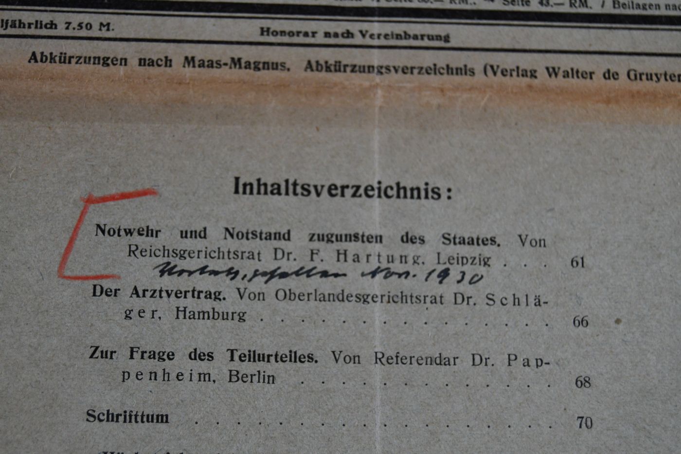 Beschreibung Einband berieben, bestoßen und gebräunt. Handschriftliche Notiz wohl von Fritz Hartung (Vortrag, gehalten Nov. 1930) auf dem Inhaltsverzeichnis. Mit Durchgehendem QUerfalz. Spuren eines Poststempels auf dem Rückdeckel. "Fritz Hartung (* 4. April 1884 in Homberg, Bez. Kassel; † 14. Mai 1973 in Göttingen) war ein deutscher Jurist und nach 1945 bekannter Strafrechts- und Strafprozessrechtskommentator in der Bundesrepublik." (Wikipedia)