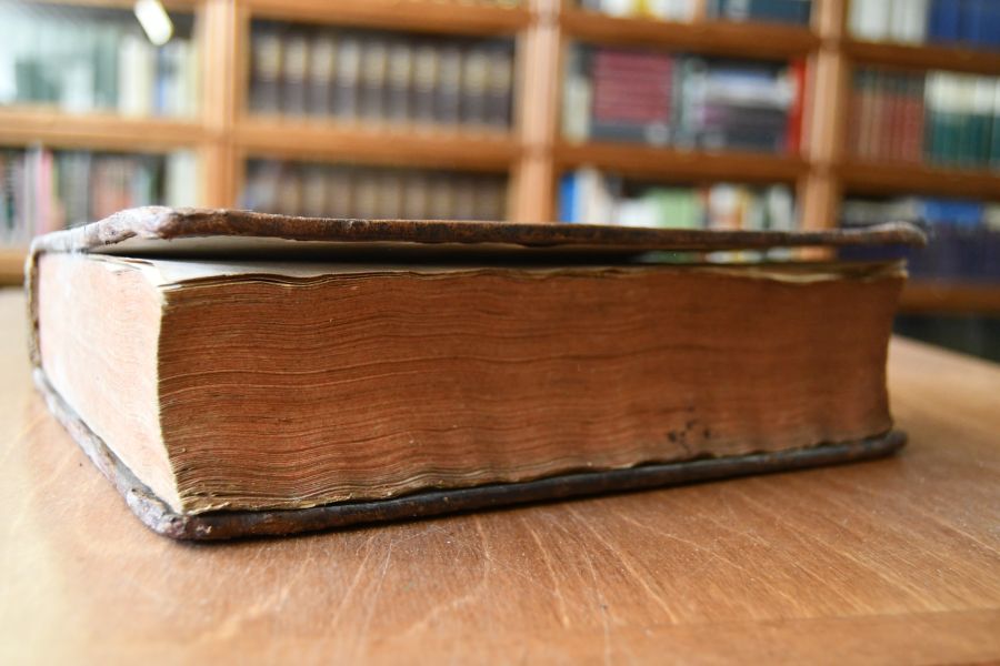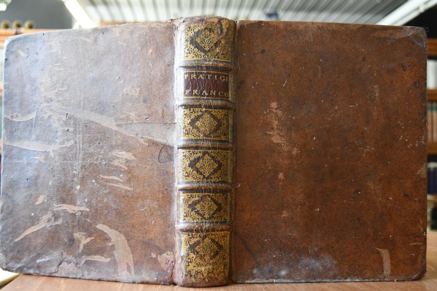 Format 26 x 21 cm, Leder auf fünf Bünden, mit Rückenvergoldung und Rückenschild sowie umlaufendem Sprengschnitt