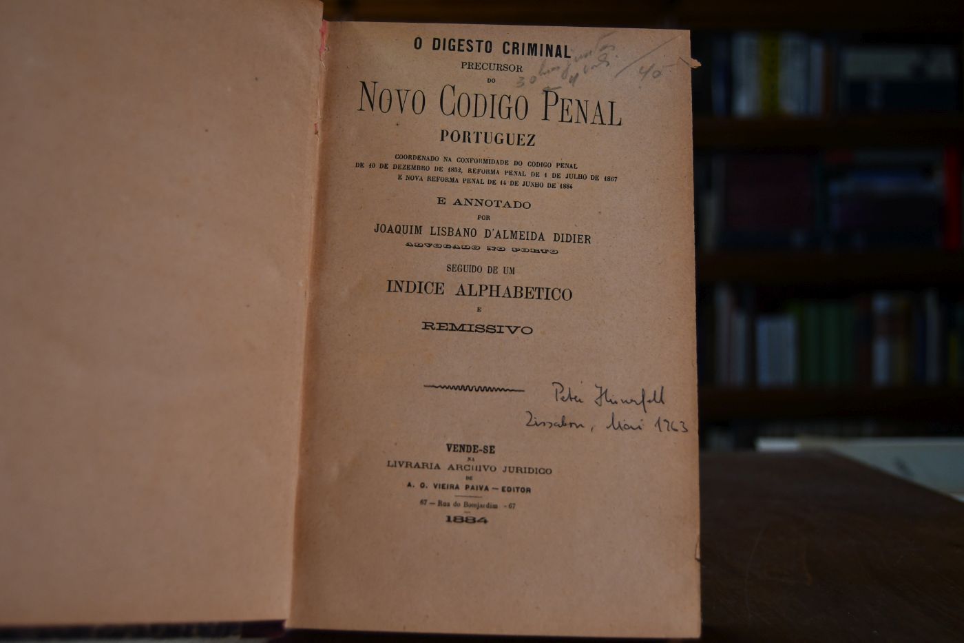 O Digesto Criminal precursor do Novo Codigo Penal Portuguez coordenado na conformidade do Codigo Penal de 10 de Dezembro de 1852, refurma penal de de 1 de Julho de 1867 e nova reforma penal de 14 de Junho de 1884 e annotado por JoaquimLisbano d`Almeida Didier. Seguido de um Indice alphabetico e remissivo. Beigebunden 1.Codigo de Justica Militar para o exercito de terra, 104 S., o.O., o.V. (um 1875); 2. Codigo Penal Portoguez Tomo II, Projecto, Lisboa, Imprensa Nacional, 1864, 200 S.; 3. Codigo Penal Portuguez, Tomo 1, Relatorio, Lisboa, Imprensa nacional, 1864, 255 S.