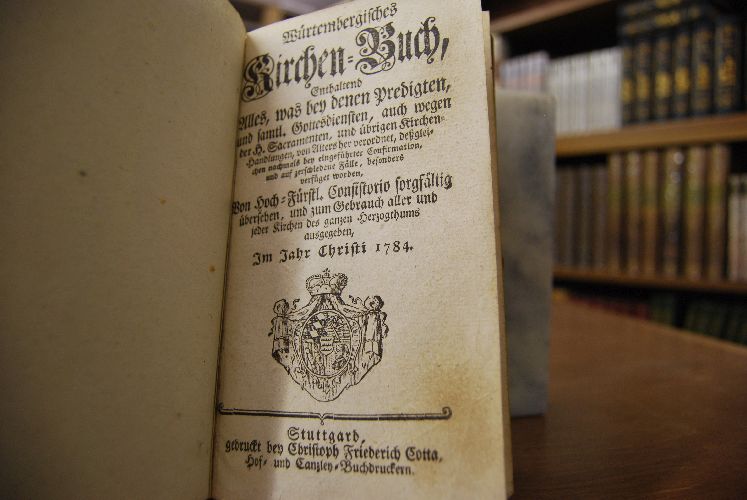 Würtembergisches Kirchen-Buch, Enthaltend Alles, was bey denen Predigten, und samtl. Gottesdiensten, auch wegen der H. Sacramenten, und übrigen Kirchen-Handlungen, von Alters her verordnet, deßgleichen nachmals bey eingeführter Confirmation, und auf zerschiedene Fälle, besonders verfüget worden, Von Hoch-Fürstl. Consistorio sorgfältig übersehen, und zum Gebrauch aller und jeder Kirchen des ganzen Herzogthums ausgegeben im Jahr Christi 1784. Beigebunden Würtenbergisches Kirchen-Buch, enthaltend Die Sonn- Fest- und Feyertägliche Evangelien, Episteln, und Texte, welche auf jede solche Zeit vorgeschrieben sind. Ingleichem die Leidens-Geschichte unseres Herrn und Heilandes Jesu Christi, welche aus denen vier Evangelisten zusammen gezogen, jährlich in der Palm-Woche verlesen, und summarisch erkläret, über das zweyte Jahr aber durch die ganze Fasten-Zeit ausführlich in allen Kirchen vorgetragen und ausgeleget wird. 1784.