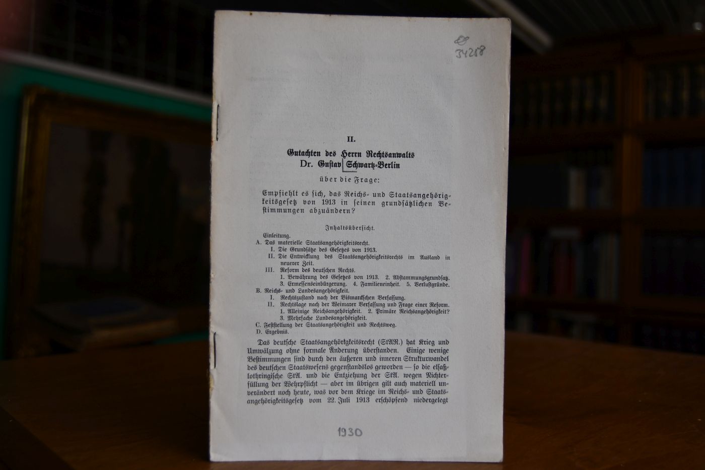 Gutachten des Herrn Rechtsanwalts Dr. Gustav Schwartz-Berlin über die Frage Empfielt es sich, das Reichs- und Staatsangehörigkeitsgesetz von 1913 in seinen grundsätzlichen Bestimmungen abzuändern?