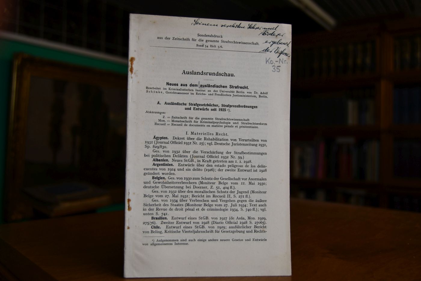 Beschreibung Einband fleckig, berieben, bestoßen und mit korrodierten Heftklammern. Handschriftliche Widmung von Adolf Schönke wohl an James Goldschmidt auf dem Titelblatt.