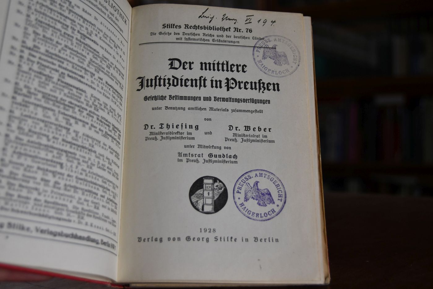 Der mittlere Justizdienst in Preußen. Gerichtliche Bestimmungen und Verwaltungsverfügungen unter Benutzung amtlichen Materials zusammengestellt. Beiliegend ein broschierter Nachtrag von 1929 mit den Seiten 340-448