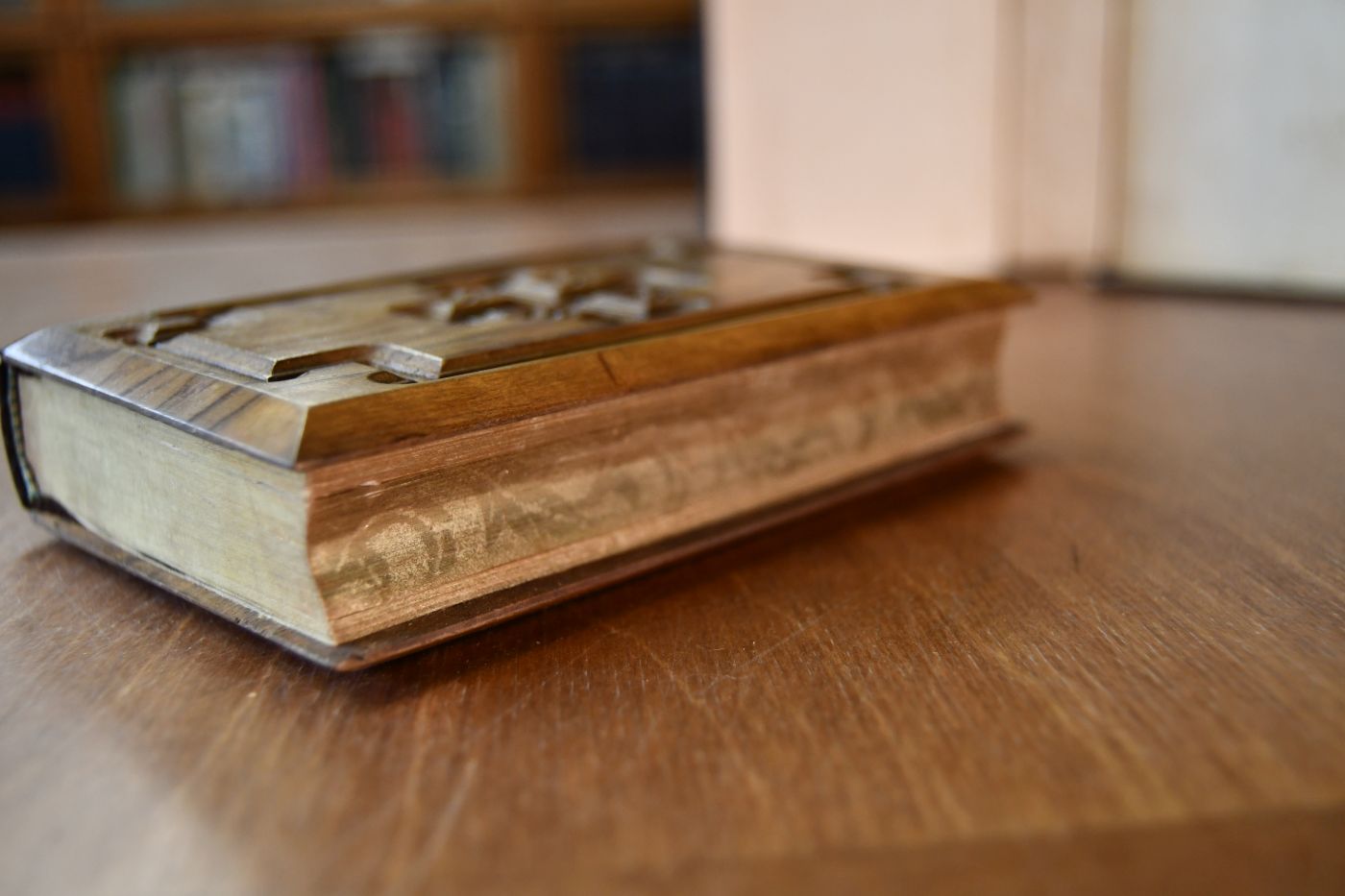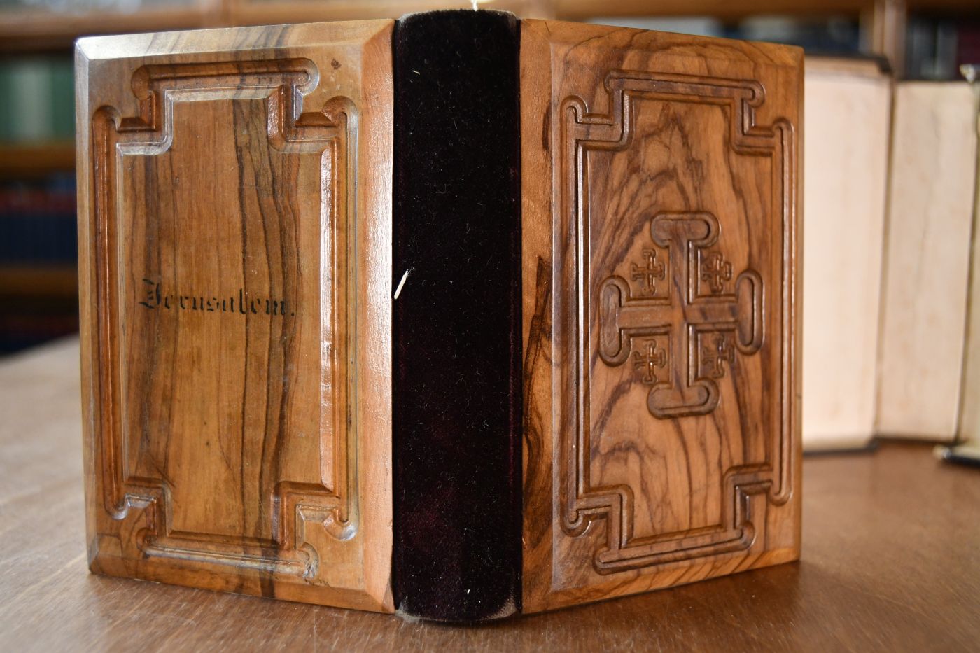 Format 13 x 9 cm, Halbsamteinband mit Olivenholzdeckeln (wohl aus Bethlehem) mit umlaufendem, verzierten Goldschnitt im OSchuber