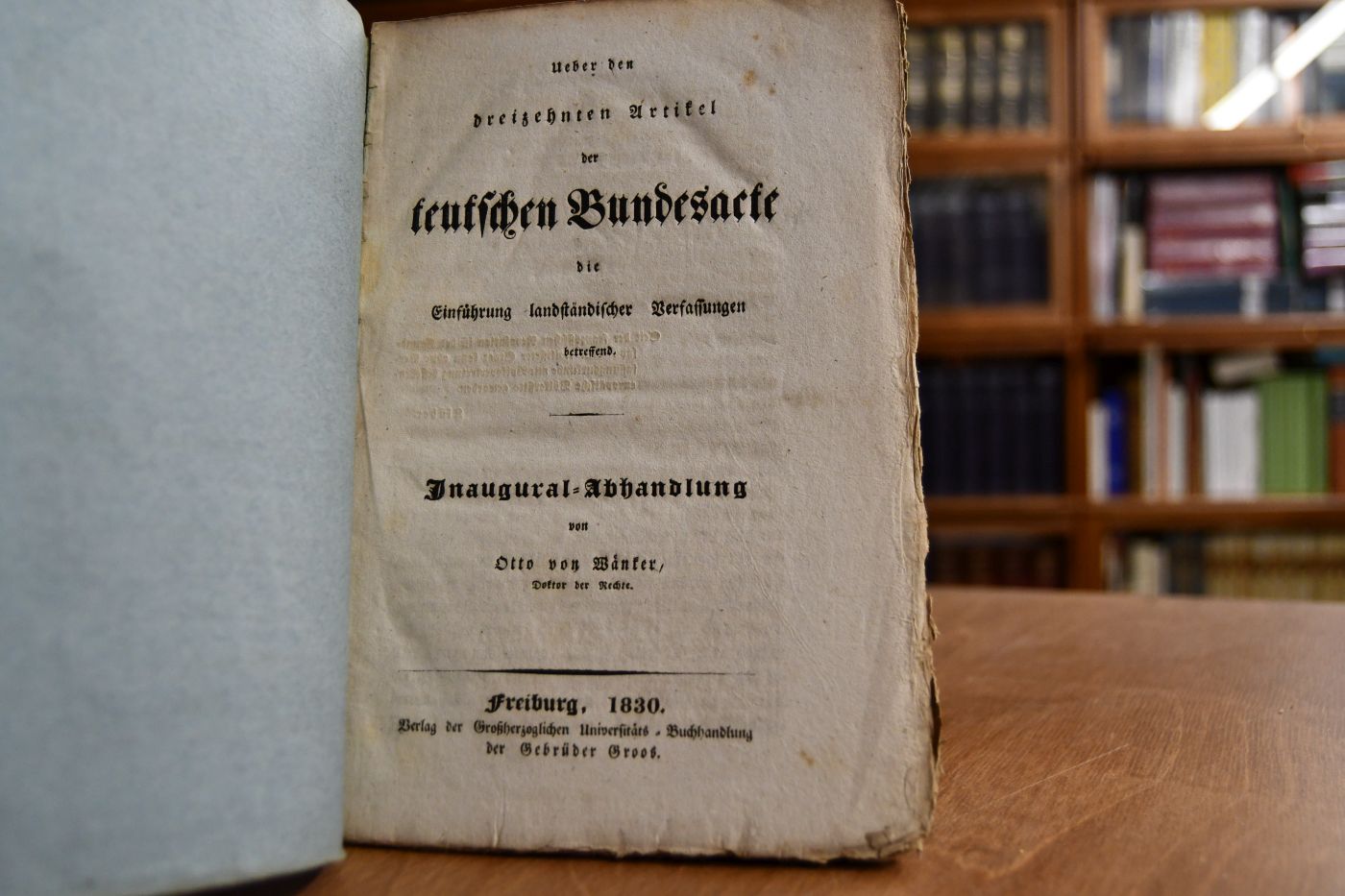 Beschreibung Einband berieben, bestoßen, gebräunt und mit Einrissen. Durchgehend fleckiug und mit Randeinrissen. Dissertation des späteren Reichtagsabgeordneten und Vertreters der Staatsanwaltschaft im Prozess gegen die badischen Revolutionäre Gustav Struve und Karl Blind.