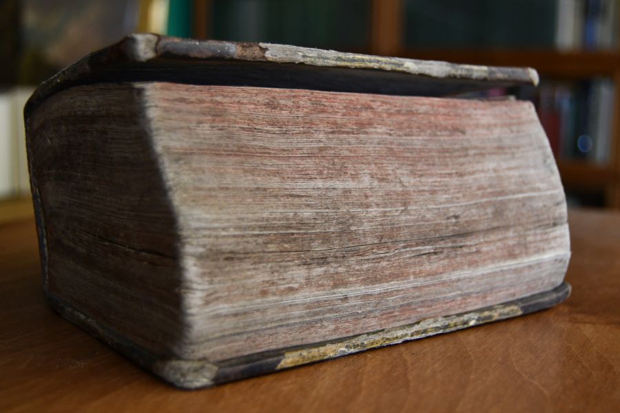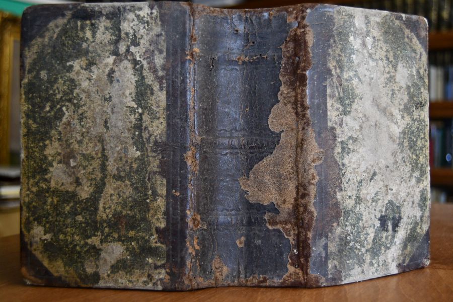 Beschreibung Einband stark berieben und bestoßen. Rücken mit teilweisem Verlust. Umlaufender Rotschnitt abgegriffen. Durchgehend fleckig und angeschmutzt. Handschriftliche Besitzereinträge (Adam Pantle, Heinrich Adam Pantle aus Groß-Bottwar 1839) und Kritzeleien auf Spiegel und Vorsatz. Hinteres Vorsatz fehlt zur Hälfte. Immer wieder eselsohrig und quetschfaltig. Seiten knapp beschnitten. Stark gebrauchtes Buch. VD18 14231727.
