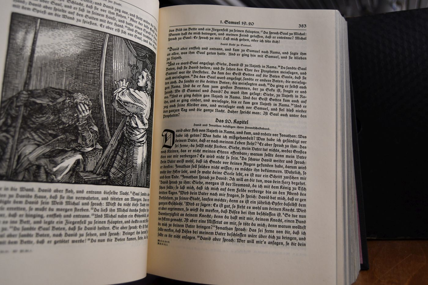 Beschreibung Einband etwas berieben. Schutzumschlag in 2 Teile getrennt und mit Einrissen und Fehlstellen. Die Bibelillustrationen des Malers und Graphikers Rudolf Schäfer (1871 Altona - 1961 Rotenburg-Wümme), gehören zu den bedeutendsten des 20. Jahrhunderts. Die Familienchronik (am Ende) ist unbenutzt.