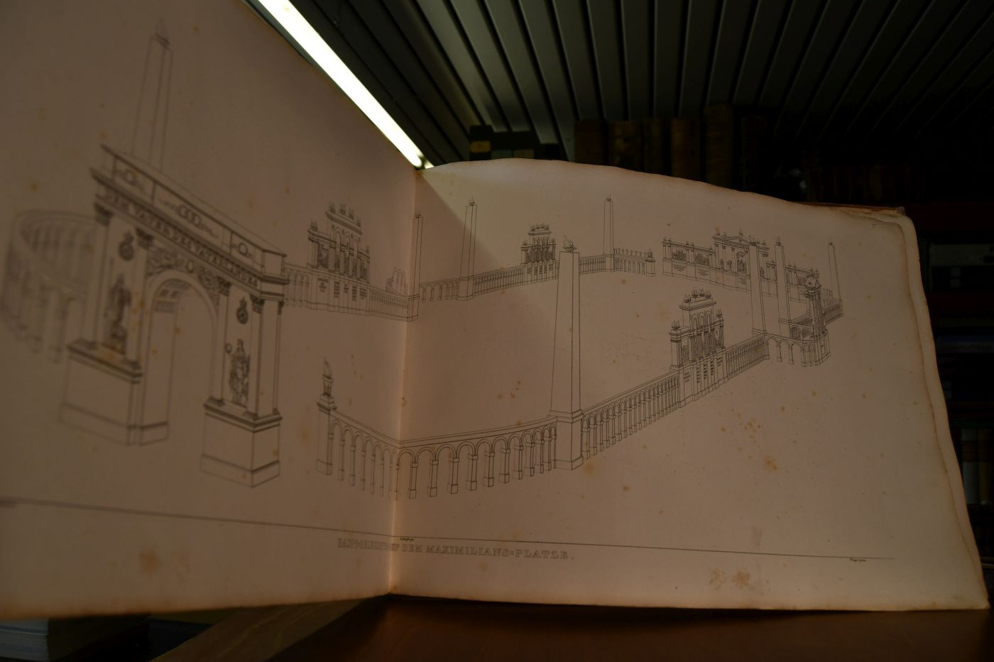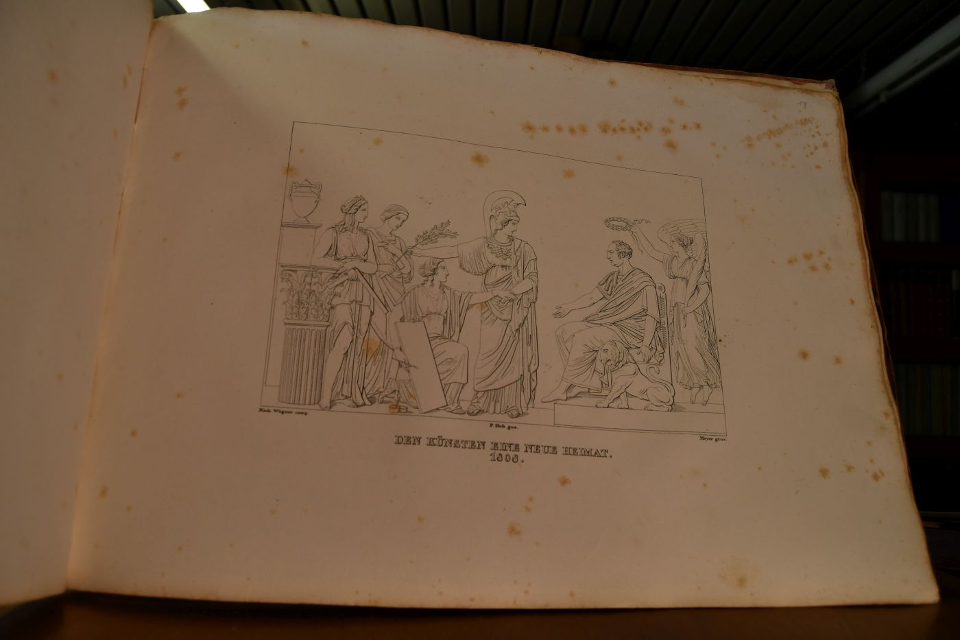 Seiten 58 S. 44 (statt 45, es fehlt die Ansicht von Tegernsee, die als Fotokopie beiliegt) (2 dpblgr.) umrißrad. Taf. nach P. Heß, D. Quaglio u. a., 4 Bll. Noten.