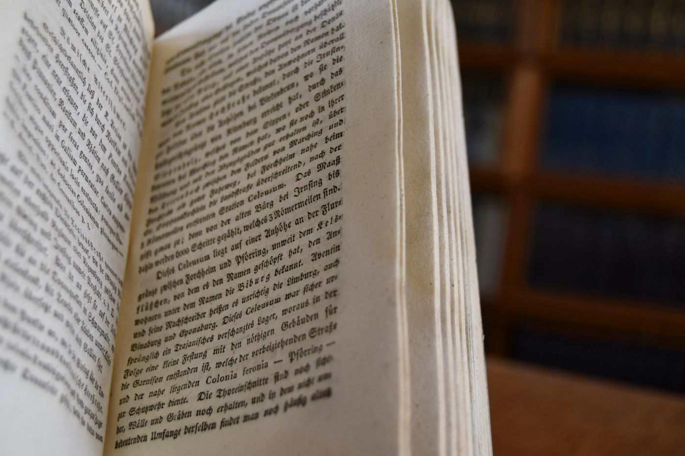 Beschreibung Einband berieben und bestoßen. Durchgehend fleckig und feuchtigkeitsrandig. Einige Seiten stärker angeschmutzt. Beinhaltet: Fr. Xav. Mayer, Monographien, oder topographische Ortsbeschreibungen des Landgerichts-Bezirks Riedenburg (Ritenburg) in dem Kreise Oberpfalz und Regensburg.S, 181-392; v. Voith, Der Hammer zu Aicholting, S. 1-67, Gandershofer, Ueber die vielerlei Benennungen Regensburgs, S. 71-72, Schuegraf, Hailsberg und die Truchsessen von Hailsberg und Eckmühl; S. 73-135, Julie v. Zerzog, Das alte Schloß zu Laaber, S. 135-140, Pangkofer, Der Judenstein am Salzstadel zu Regensburg, S. 140-142, Schuegraf, Ueber einige Denksteine an den Stadtmauern zu Regensburg, S. 142-147, Oesterreicher, Urkundliche Nachrichten von einigen Wüstungen in der Oberpfalz, S. 148-155, Pangkofer, Keppler`s Bildniß und dessen Echtheit, S. 156-164, v. Fink, Nachtrag zur Monographie des ehemaligen AMtes Murach, S. 165-175, v. Fink, Nachlese zur Monographie der ehemaligen Grafschaft Sternstein, S.176-182, v. Voith, Der Hammer Menschendorf und der Hammer zu Zangenstein, S. 183-198, v.Bedall, Verzeichniß der in der Fürstengruft zu Sulzbach in Gott ruhenden Durchlauchtigsten Ahnen des K. Regentenhauses, S. 199-213, G.Diener, Um welches Jahr fing die Reformation in Amberg an, S. 214-253, v. Fink, Beitrag zur Geschichte des ehemaligen Landgerichts Auerbach, S. 253-271, Schuegraf, Chronik von Michelsberg und Bodenstein, S, 323-339, Schuegraf, Ueber das in der Domprobstei zu Regensburg entdeckte römische Denkmal, S. 340-352.