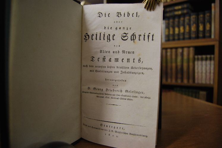 Die Bibel oder die ganze Heilige Schrift des Alten und Neuen Testaments, nach den neuesten besten deutschen Übersetzungen, mit Einleitungen und Inhaltsanzeigen, herausgegeben von D. Georg Friederich Griesinger, Königlich Würtembergischen Prälaten und Ober-Consistorial-Rathe, des Königl. Würtemb. Civil-Verdienst-Ordens Ritter. Hier nur das Alte Testament in einem Band.