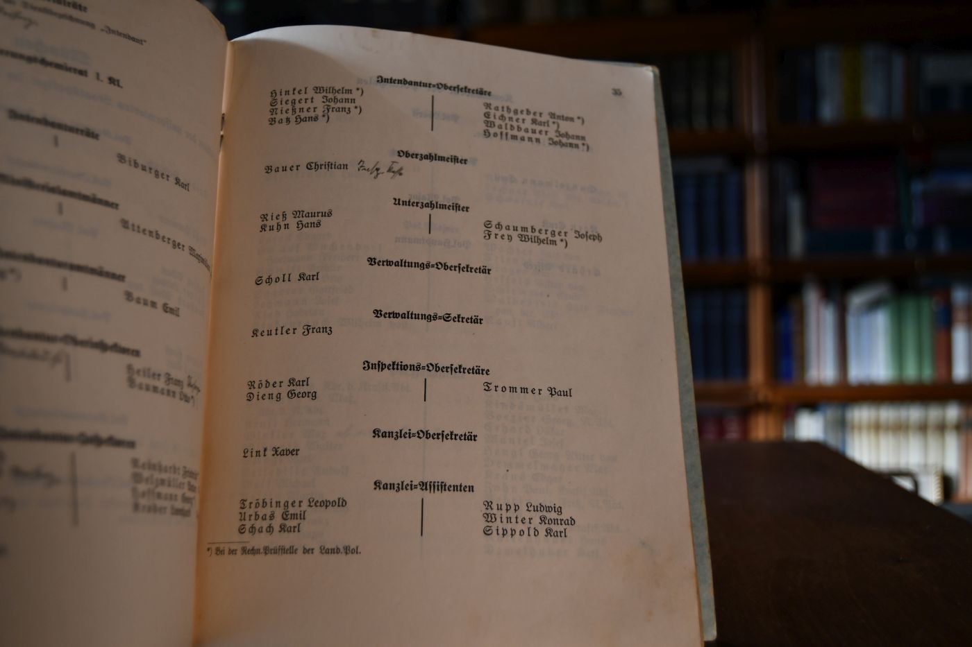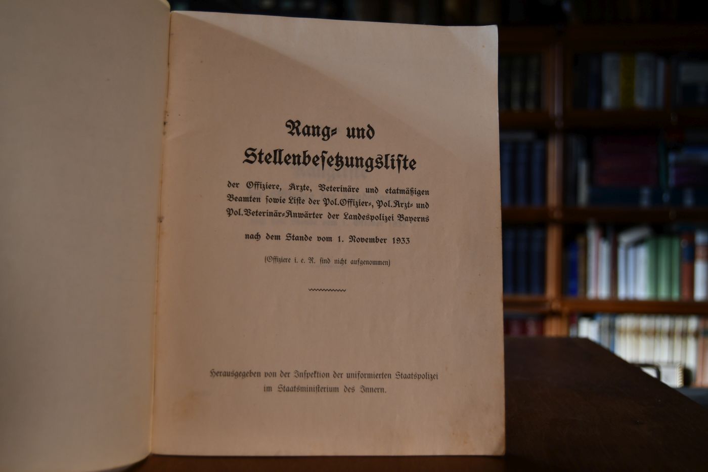 Rang- und Stellenbesetzungsliste der Offiziere, Ärzte, Veterinäre und etatmäßigen Beamten sowie Liste der Pol.Offizier-, Pol.Arzt- und Pol.Veterinär-Anwärter der Landespolizei Bayerns nach dem Stande vom 1. November 1933 (Offiziere i.e.R. sind nicht aufgenommen).