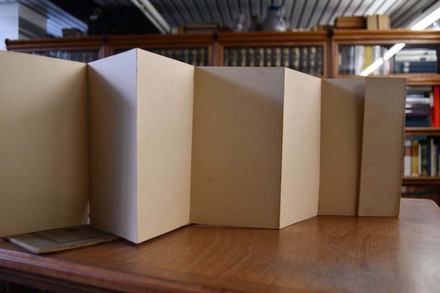 Beschreibung Einband berieben, bestoßen, gebräunt, fleckig, mit Einrissen und etwas Verlust. Durchgehend fleckig. Die gebräunte Karte ist an den Faltungen weitgehend aufgetrennt und die Einzelsegmente nahezu lose.