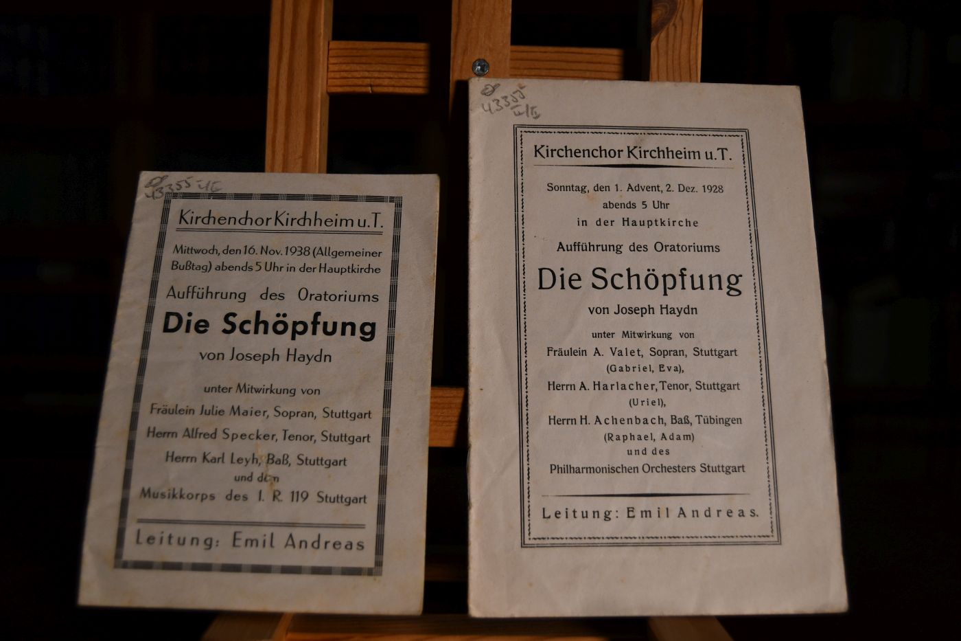 2 Texthefte des Kirchenchores Kirchheim u.T. zur Aufführung des Oratoriums Die Schöpfung von Joseph Jaydn vom 16. 11. 1938 und vom2. 12. 1928 in der Hauptkirche in Kirchheim unter Teck.