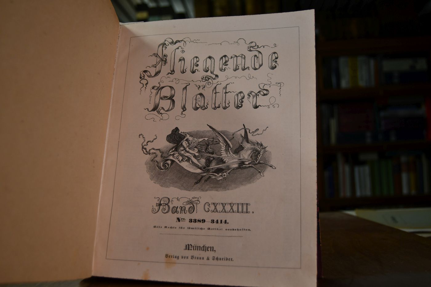 Fliegende Blätter. Band 138. Nr. 3396, 3397, 3399-3400, 3402-3404, 3406, 3410, 3412-3414 mit den jeweiligen Beiblättern, die angebunden sind.