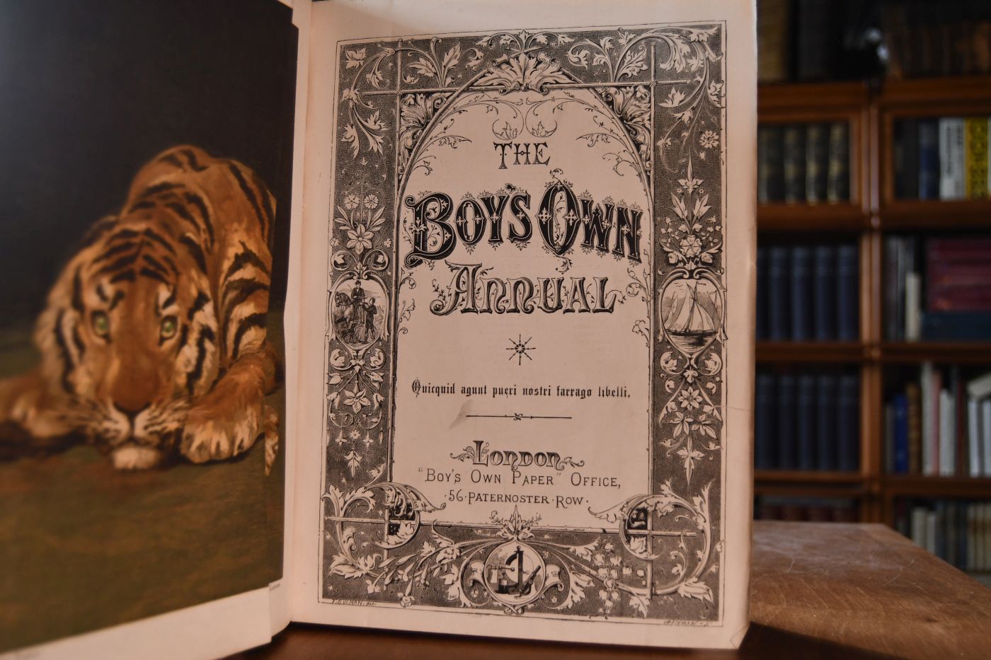 Beschreibung Einband berieben, bestoßen und am Rücken mit Einrissen und Fehlstellen. Fälze sich öffnend. Einband und Titelblatt von The Boy`s Own Annual. Die Tafel vor S. 494 (Colours of the British Army) fehlt. Schnitt fleckig. Tafel vor S. 543 vorgefallen und mit Randeinrissen.