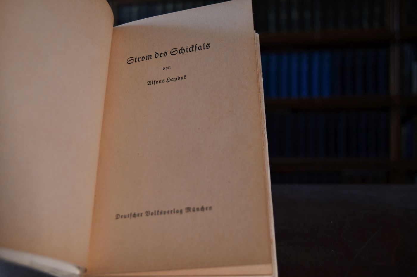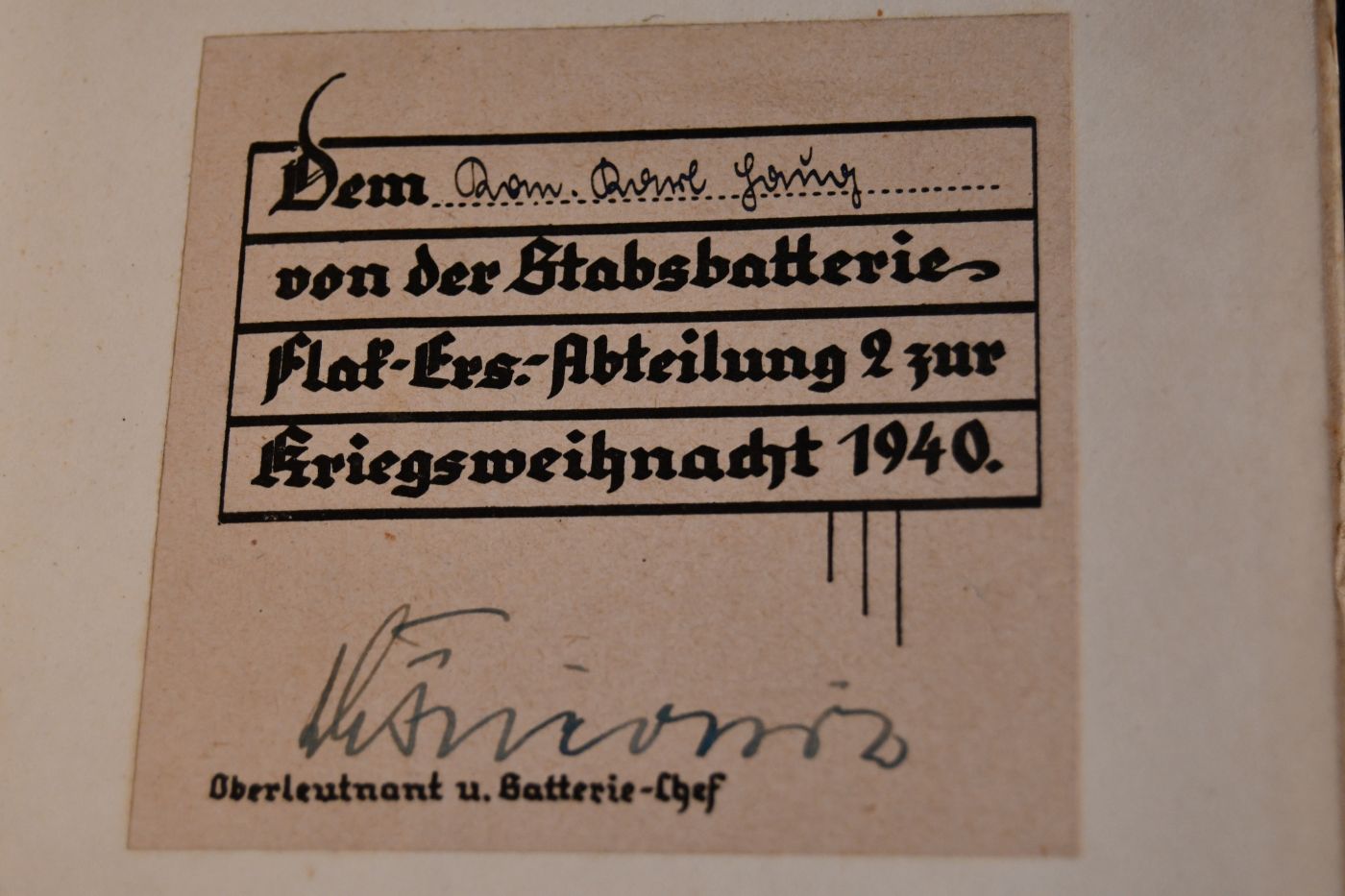Beschreibung Schutzumschlag berieben, bestoßen, angeschmutzt, fleckig und mit Einrissen. Militärische Widmung (Flak-Ers.-Abteilung 2) mit Unterschrift eines Oberleutnants und Batterie-Chefs auf dem fliegenden Vorsatz. Papierbedingt gebräunt.