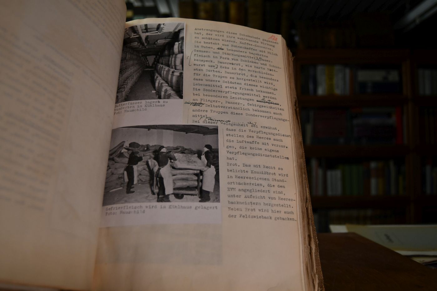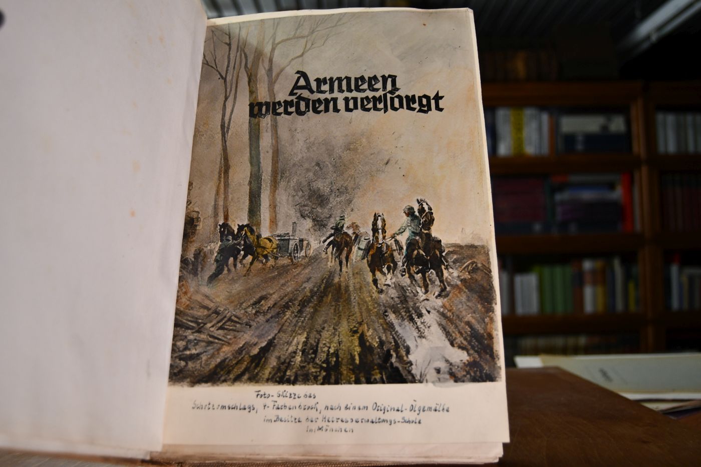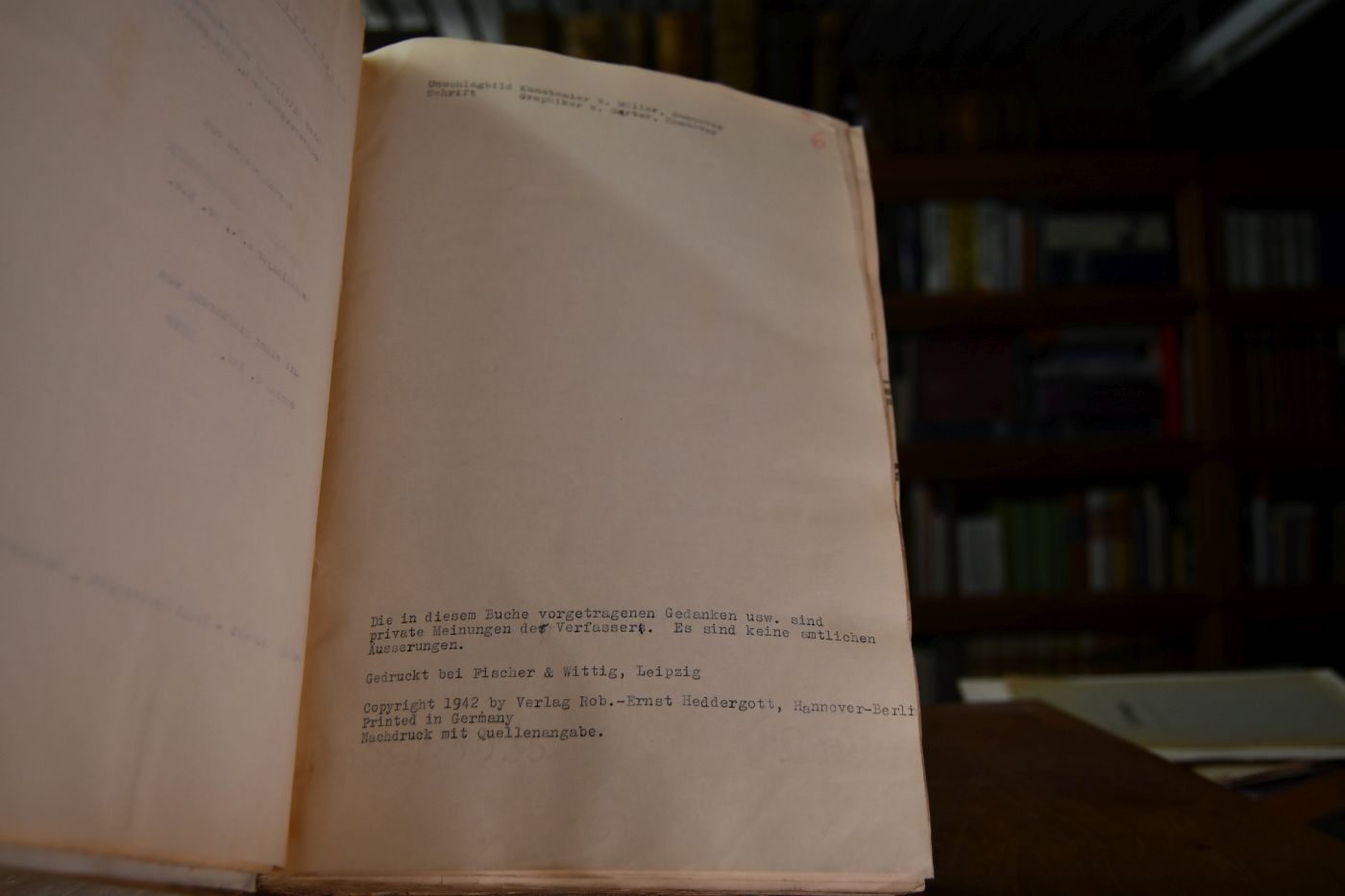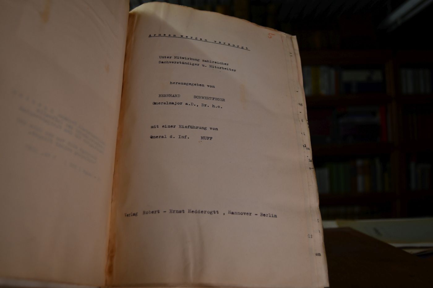 Beschreibung Einband berieben, bestoßen, fleckig und mit Einrissen. Leinen löst sich an Kante vom Rücken. Vorderer Innendeckel mit Klebebandstreifen. Durchgehend immer wieder fleckig bzw. angeschmutzt. Typoskript eines unveröffentlichten Buches. Laut den Angaben eines Vorbesitzers soll es bei Kriegsende in der Festung Küstrin gefunden worden sein. Die Buchveröffentlichung sollte wohl vom Verlag Robert- Ernst Heddergott, Hannover-Berlin ausgeführt werden, ist aber wohl auf Grund der Kriegswirren nicht erfolgt. Inhaltverzeichnis: Zur Einführung von Gen.d.Inf. Muff S.7, Vorwort des Herausgebers Gen.MAj. a.D. Dr. h.c. Schwertfeger S. 7d, Geschichtliche Entwicklung der Heeresversorgung von Generalmajor Dr. h.c. Schwertfeger S.8, Aufbau der heutigen Heeresverwaltung v. O. Pinkepank S. 104, Geldversorgung und Abrechnung v. O. Pinkepank S. 113, Die Heeresverwaltung sorgt für Mann und Pferd v. O. Pinkepank S. 116, Kochgeräte, Truppenküchen und Kochen bei der Wehrmacht von O. Pinkepank S. 131, Der Mitropawagen der Wehrmacht von Oberzm. Watzke S. 143, "Ei der Blitz, das ist ja die Gustel von Blasewitz", von der Marketenderin zur Grossmarketenderei von O. Pinkepank S. 152, Nachschub für die Armeen von O. Pinkepank S. 160, Das deutsche Nachschubwunder von Kr.-Ber. Groß-Talmon S. 174, Brot hilft siegen! Kampf und Einsatz einer Bäckerei-Kompanie von Kr.-Ber. Groß-Talmon S. 191, Beim Intendanten einer Panzergruppe von Kr.-Ber. Groß-Talmon S. 197, Wiedersehen mit Nikolajew, Sowjetwirtschaft in deutscher Hand von Kr.-Ber. Groß-Talmon S. 200, Was wir "erben" konnten. Erbeutete englische und französische Vorräte. Sicherstellung von Weichselkähnen mit wertvoller Ladung von Stabszm. Müller S. 205, Versorgung von Kriegsgefangenen von Stabszm. Müller S. 210, Heeresbauwesen. Die Kaserne und ihre Geschichte von Architekt F.O. Goy S. 240, Heereslandwirtschaft von O. Pinkepank S. 266, Heeresforstwirtschaft von O. Pinkepank S. 272, Der Wehrmachtbeamte von O. Pinkepank S. 369, Versorgung mit Bekleidung S. 212, Geschichte der Uniformen von Dr. Lünsmann S. 212, Herstellung der Bekleidung. Etwas von Feldblusen und Marschstiefeln vonO. Pinkepank S. 228, Versorgung mit Kriegswaffen S. 212, Von der Feldschlange zum modernen Geschütz von O. Pinkepank S. 277, Die Entwicklung der Handfeuerwaffen von O. Pinkepank S. 287, Vom Kriegselefanten zum Panzer von O. Pinkepank S. 295, Die ärztliche Betreuung der Heere im Wandel der Jahrhunderte von O. Pinkepank S. 299, Veterinärdienste von O. Pinkepank S. 333, Die geistige Betreuung der Truppe von Gauobmann W. Köhler S. 324, Wehrmachtbetreuungsstellen und Soldatenheime von O. Pinkepank S. 330, Die Feldpost S. 339, Das Band zwischen Heimat und Front von O. Pinkepank S. 339, Brücken zur Heimat von Kr.-Ber. Groß-Talmon S. 343, Hilfsorganisationen der Wehrmacht S. 348, Organisation Todt von Brigadeführer Lidl S. 348, NSKK im Fronteinsatz von Brigadeführer Lidl S. 351, Der Reichsarbeitsdienst und sein Fronteinsatz von Oberfeldmeister Pradel S. 358, Einsatz der Technischen Nothilfe v. Bez.-Führer Ebeling S. 363, Das Deutsche Volk im totalen Krieg von Hauptschriftleiter Fr. Hirschner S. 382.