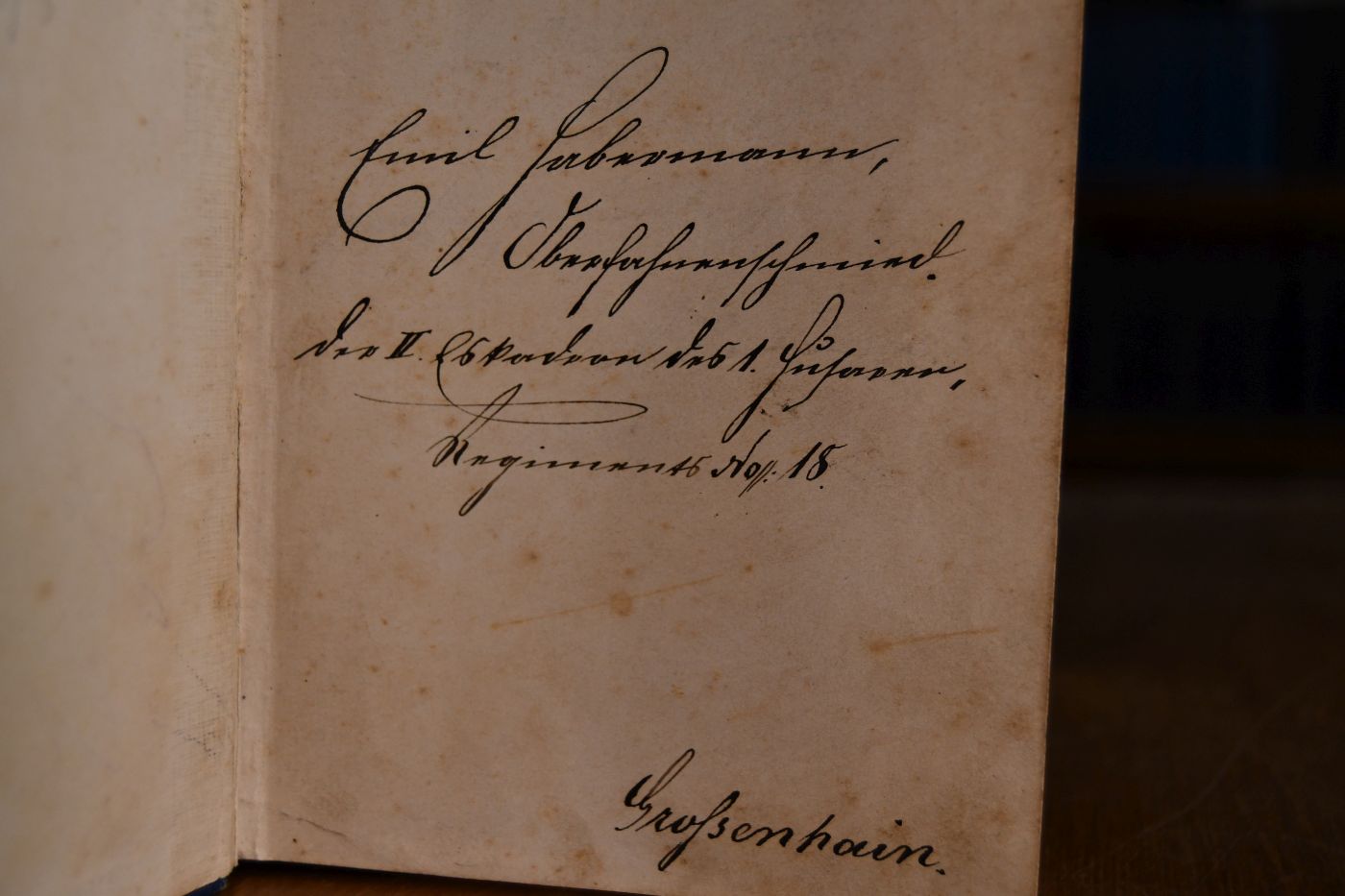 Beschreibung Einband berieben, bestoßen und fleckig. Schnitt und innen durchgehend fleckig und angeschmutzt. Handschriftlicher Besitzereintrag (Emil Habermann, Oberfahnenschmied der II. Eskadron des 1. Husaren Regiments No. 18 Großenhain) auf dem fliegenden Vorsatz.