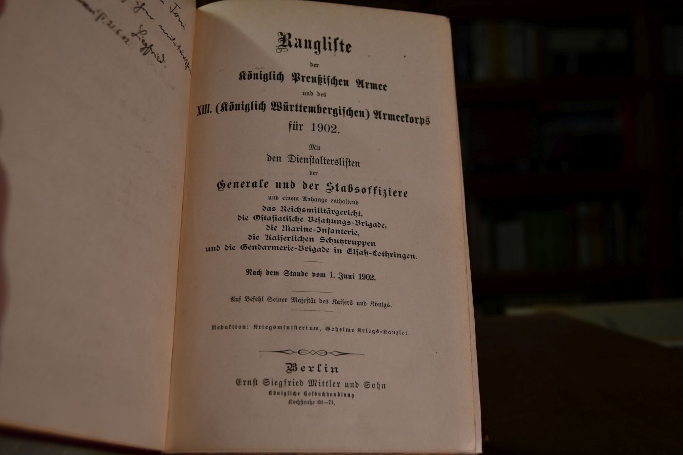 RANGLISTE DER KÖNIGLICH PREUSSISCHEN ARMEE UND DES XIII. (Königlich Württembergischen) ARMEEKORPS FÜR 1902.- Mit den Dienstalterslisten der Generale und der Stabsoffiziere und einem Anhange enthaltend das Reichsmilitärgericht, die Ostasiatische Besatzungs-Brigade, die Marine-Infanterie, die Kaiserlichen Schutztruppen und die Gendarmerie-Brigade in Elsaß-Lothringen.