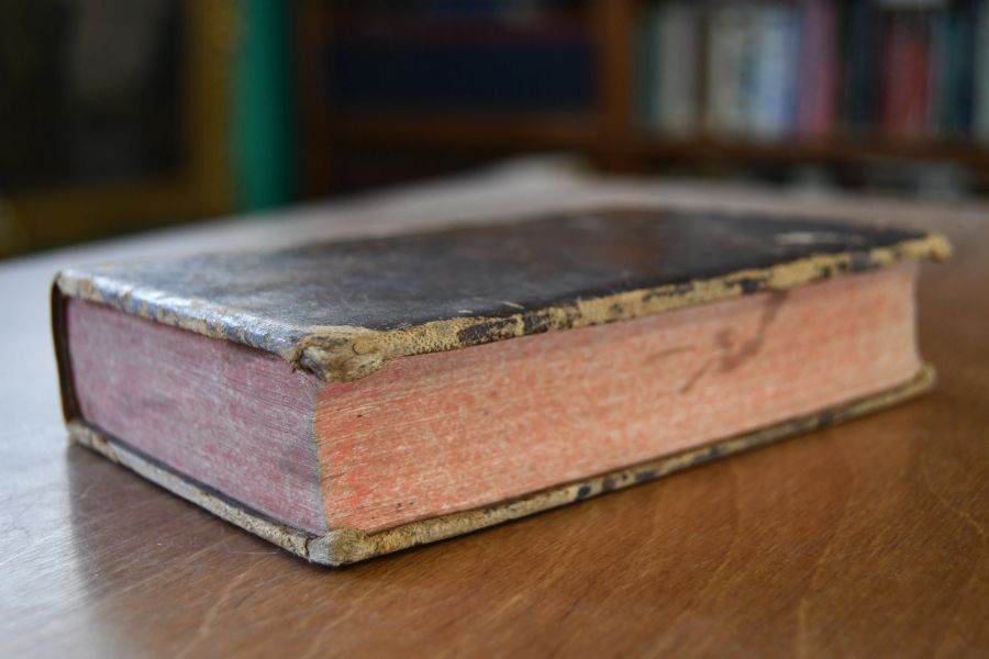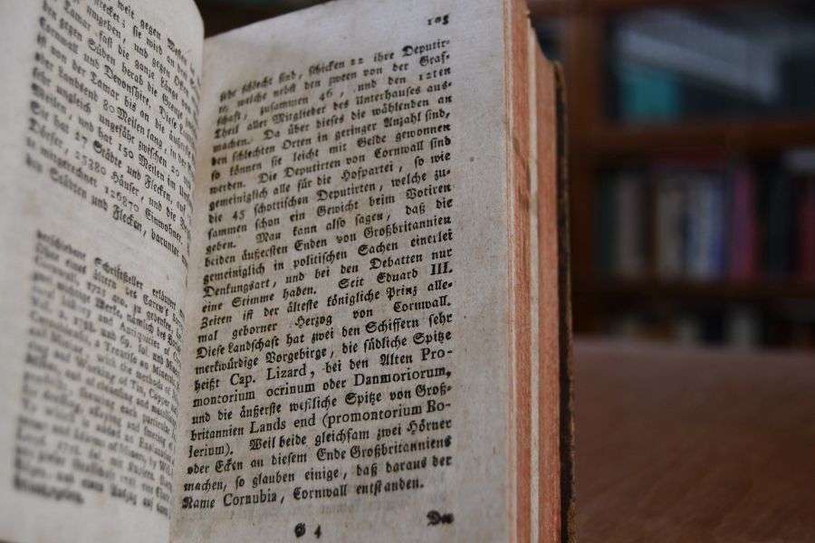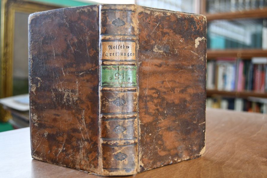 Format 17 x 11 cm, Leder der Zeit mit 5 Bünden und Rückenschild sowie umlaufenden Sprengschnitt
