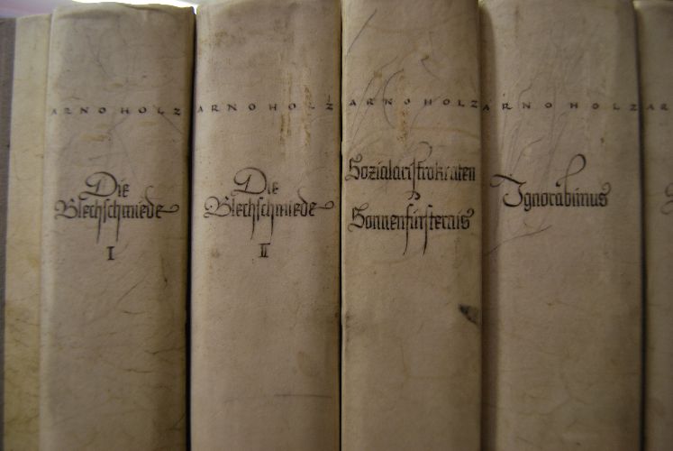 Auflage Nr. 21 von 250 Exemplaren für Hugo Zwillenberg. Jeder Band mit einer Porträtradierung von Arno Holz des Bildhauers Kurt Harald Jsenstein die von diesem und von Arno Holz signiert sind.
