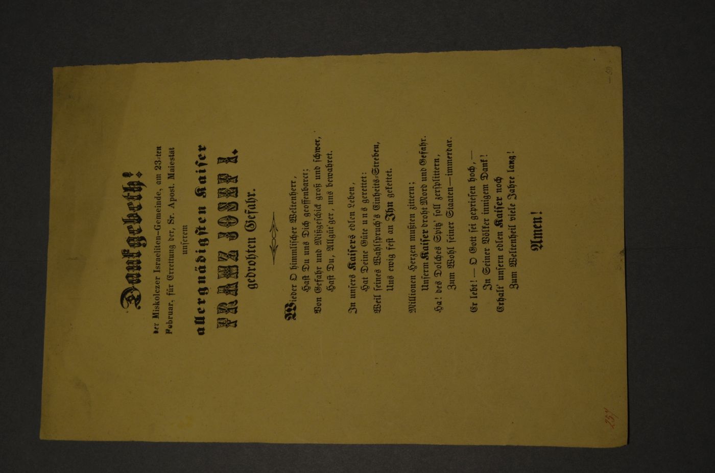 Dankgebeth! der Miskolczer Israeliten-Gemeinde, am 23-ten Februar, für Errettung der, Sr. Apost. Maiestät unserem allergnädigsten Kaiser Franz Joseph I. gedrohten Gefahr.