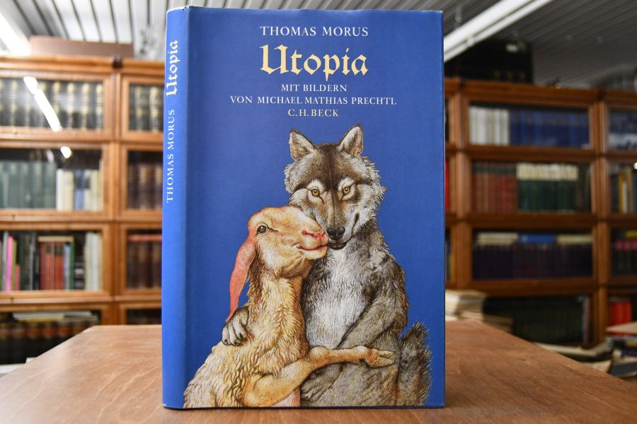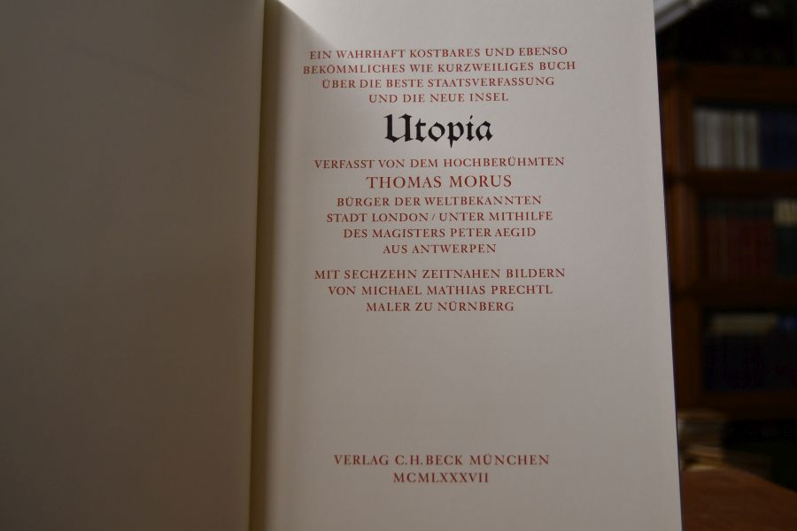Ein wahrhaft kostbares und ebenso bekömmliches wie kurzweiliges Buch über die beste Staatsverfassung und die neue Insel Utopia. Verfasst von dem hochberühmten Thomas Morus Bürger der weltbekannten Stadt London/unter Mithilfe des Magisters Peter Aegid aus Antwerpen. Mit sechzehn zeitnahen Bildern von Michael Mathias Prechtl Maler zu Nürnberg.